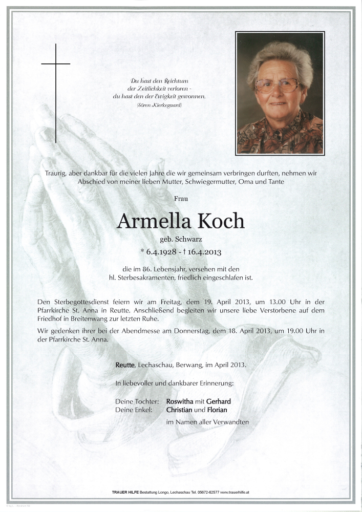 Armella war für mich ein Vorbild,ich habe sie als kleines Mädchen kennen gelernt,als sie beim Josef nach dem schweren Verlust seiner Frau den Haushalt weiter führte.Ihr war keine Arbeit zu viel.Ruhe in Frieden.