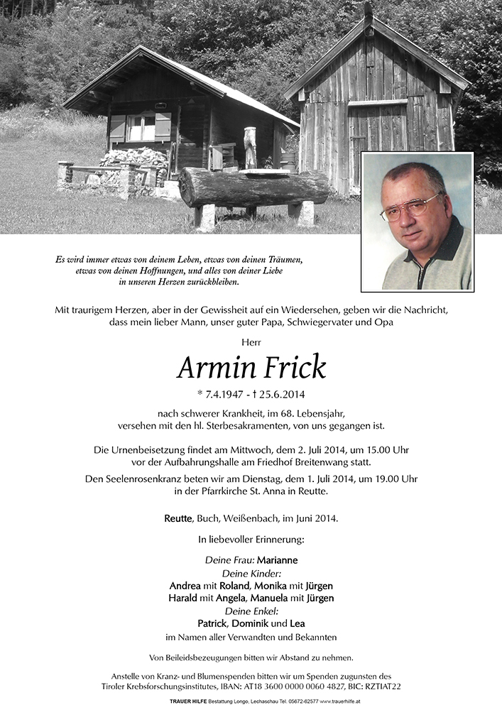 Ein Vater versteht - ohne viel Worte Ein Vater geht - ohne viel Worte, und hinterlässt eine Leere, die in Worten keiner auszudrücken vermag. Aufrichtige Anteilnahme entbieten Euch Sandra und Ferdl mit Clemens