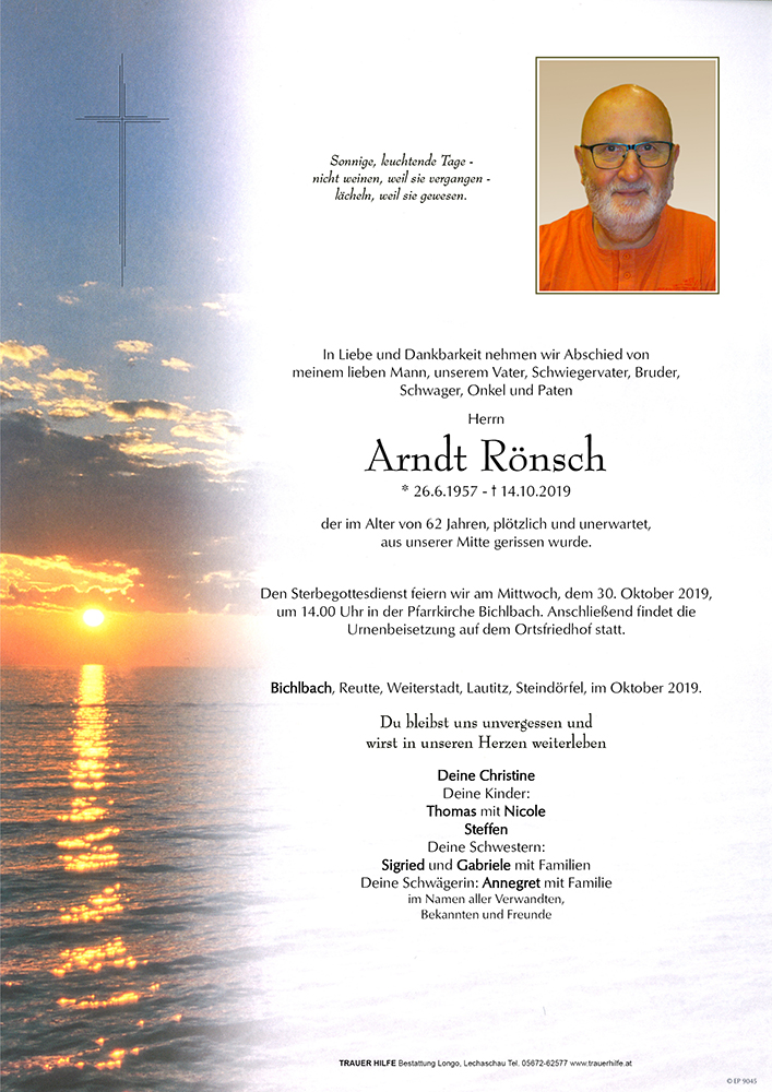 aufrichtige Anteilnahme . die Nachricht von Arndt`s Tod hat uns sehr betroffen gemacht. Wir werden seine fröhliche Art seht vermissen . Fam. Uschi und Hans Fasser
