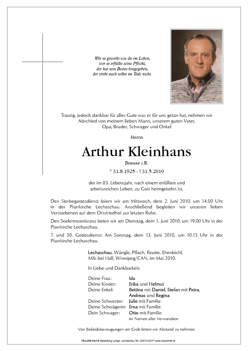 13.12.1901 31.05.2010 Lechaschau Arthur Kleinhans Action Parte Sterbebild Gedenkkerzen Kondolenzen Danksagung Parte Sterbebild Gedenkkerzen Kondolenzen Danksagung Parte herunterladen Sterbebild herunterladen Gedenkkerzen für Arthur Kleinhans 0 Einträge Kerze anzünden Ihre Gedenkkerze fürArthur Kleinhans Ihr Name* Farbe auswählen Ihre Nachricht oder Name* E-Mail-Adresse* Mit dem Klicken auf "Kerze anzünden" erklären Sie sich mit unseren Datenschutzbestimmungen einverstanden. Kondolenzbuch für Arthur Kleinhans 0 Einträge Kondolenz verfassen Ihr Abschiedsgruß an Arthur Kleinhans Ihr Name* E-Mail-Adresse* Ihre Nachricht* Mit dem Klicken auf "Gruß absenden" erklären Sie sich mit unseren Datenschutzbestimmungen einverstanden. Danksagung herunterladen