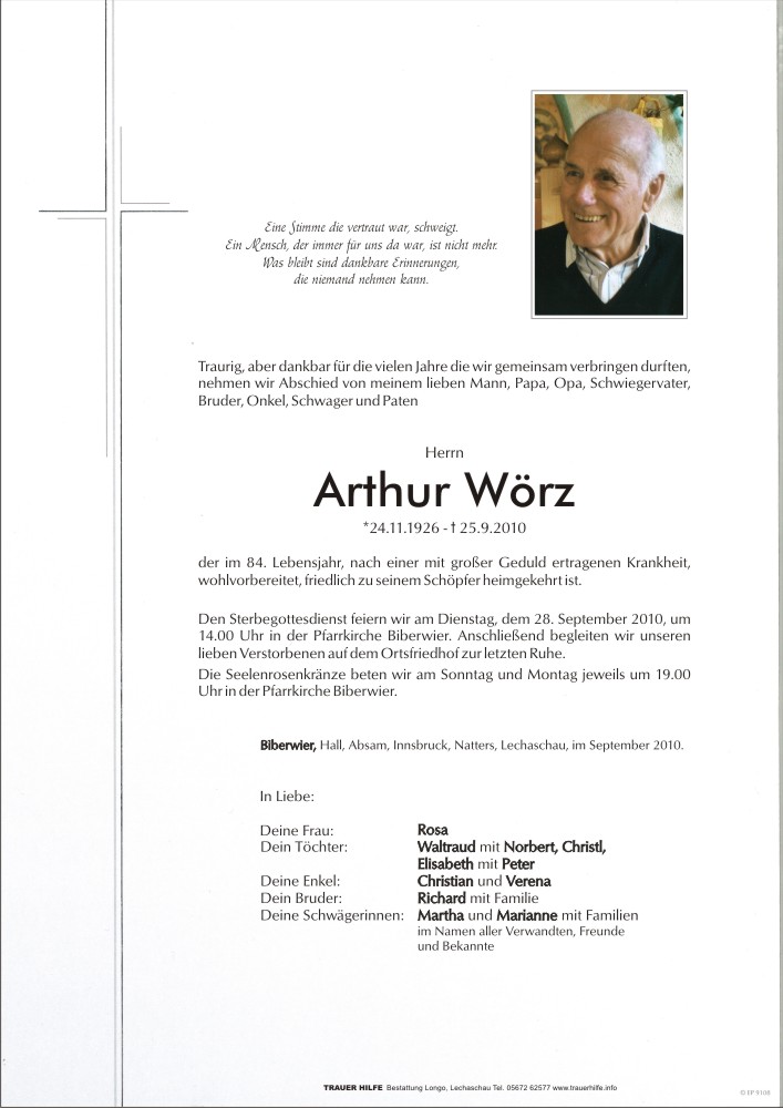13.12.1901 25.09.2010 Biberwier Arthur Wörz Action Parte Sterbebild Gedenkkerzen Kondolenzen Parte Sterbebild Gedenkkerzen Kondolenzen Parte herunterladen Sterbebild herunterladen Gedenkkerzen für Arthur Wörz 8 Einträge Kerze anzünden Waltraud Christl u. Elisabeth m. Familie. Elisabeth mit Familie wir wermissen Dich wir vermissen Dich Hosp Josef hosp josef wir vergessen dich nicht hosp Josef Ihre Gedenkkerze fürArthur Wörz Ihr Name* Farbe auswählen Ihre Nachricht oder Name* E-Mail-Adresse* Mit dem Klicken auf "Kerze anzünden" erklären Sie sich mit unseren Datenschutzbestimmungen einverstanden. Kondolenzbuch für Arthur Wörz 0 Einträge Kondolenz verfassen Ihr Abschiedsgruß an Arthur Wörz Ihr Name* E-Mail-Adresse* Ihre Nachricht* Mit dem Klicken auf "Gruß absenden" erklären Sie sich mit unseren Datenschutzbestimmungen einverstanden.