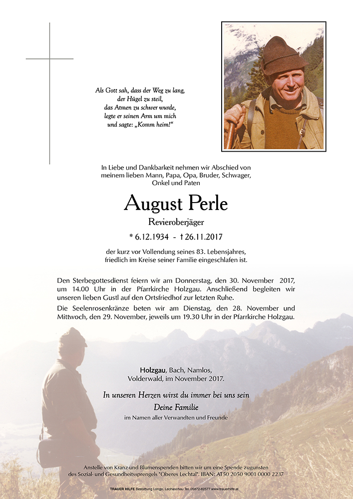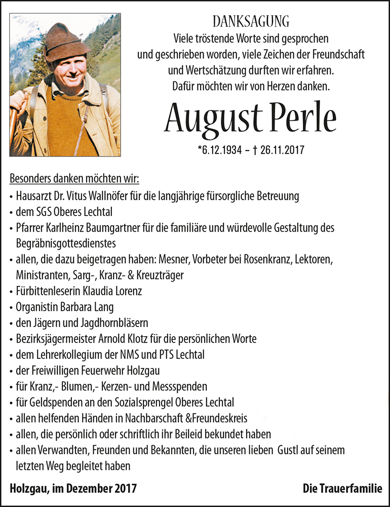 Lieber Gustl, für deine langjährige freundschaftliche Verbundenheit mit unserer Familie und für deine Hilfe kann ich dir nur mehr auf diese Weise Danke sagen. Mama wird den "Hoagart" mit dir sehr vermissen.