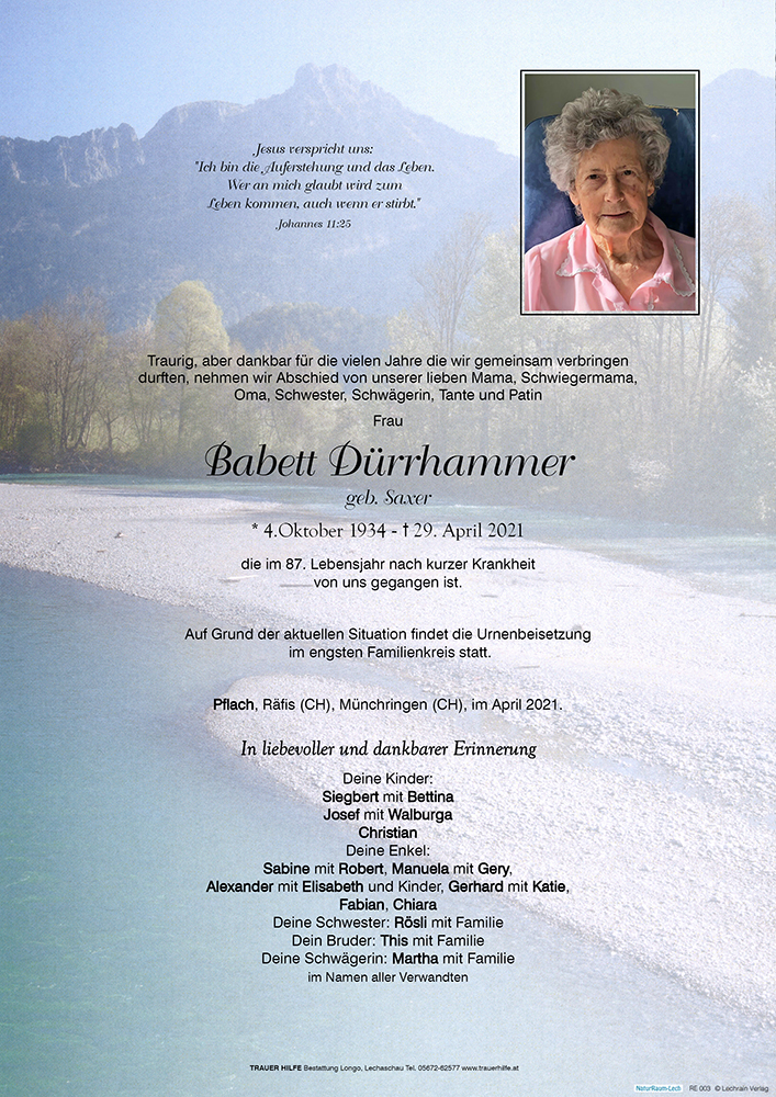 Tief berührt möchten wir Euch unsere herzliche Anteilnahme aussprechen. Mit unseren Gedanken sind wir bei Euch und trauern mit Euch. Wir denken gerne an die vielen gemeinsamen, stets fröhlichen Stunden mit eurer Mutter und Oma Babett.