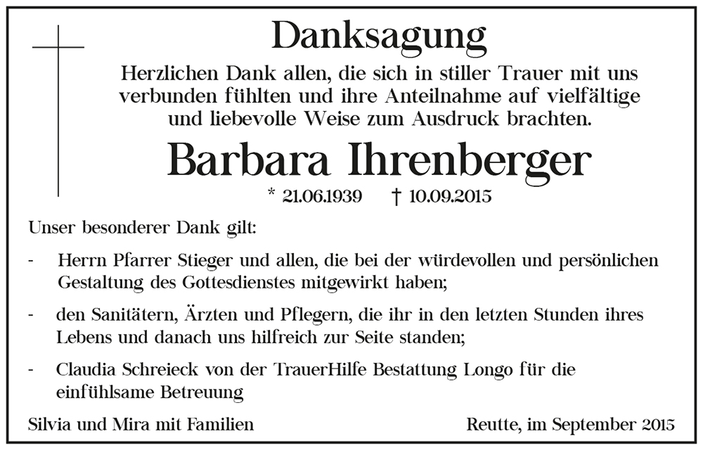 Liebe Barbara, gerade noch unterhielten wir uns am Gartenzaun. Nie hätte ich geglaubt, dass es das letzte nachbarschaftliche Gespräch wäre. Ich bin zutiefst erschüttert, mein Mitgefühl gilt deinen Töchtern, Christl Blaas