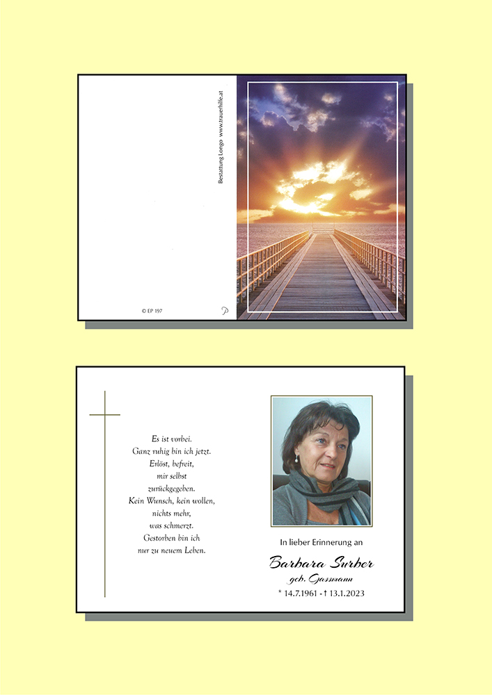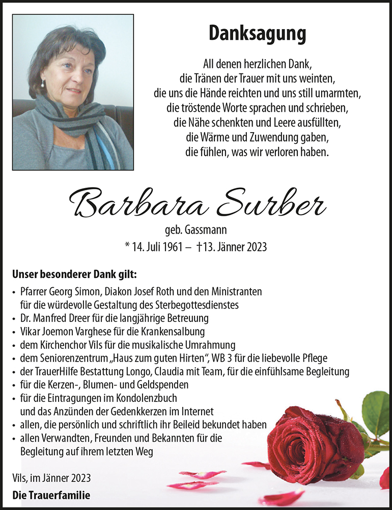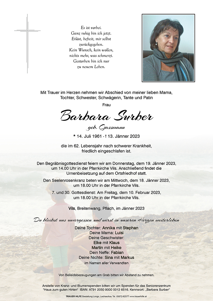 Trauert gemeinsam und erinnert euch an die schönsten Stunden in denen ihr mit Barbara zusammen ward, denn in eurer Erinnerungen bleibt ihr Barbara verbunden.