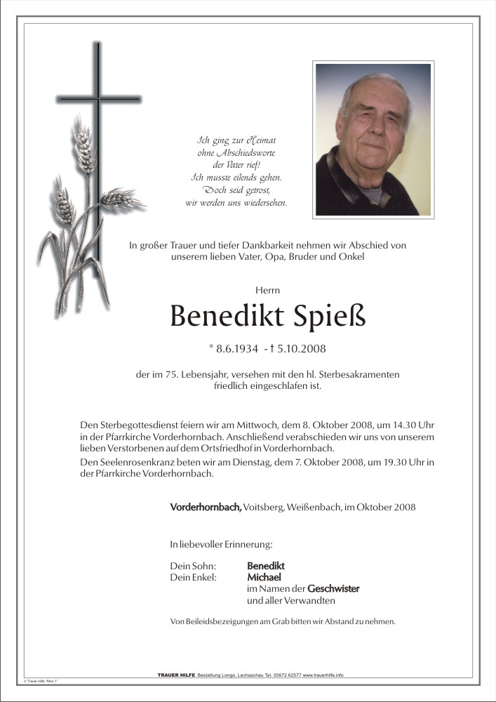 13.12.1901 05.10.2008 Vorderhornbach Benedikt Spieß Action Parte Gedenkkerzen Kondolenzen Parte Gedenkkerzen Kondolenzen Parte herunterladen Gedenkkerzen für Benedikt Spieß 3 Einträge Kerze anzünden Herbert Rainer für dich Ihre Gedenkkerze fürBenedikt Spieß Ihr Name* Farbe auswählen Ihre Nachricht oder Name* E-Mail-Adresse* Mit dem Klicken auf "Kerze anzünden" erklären Sie sich mit unseren Datenschutzbestimmungen einverstanden. Kondolenzbuch für Benedikt Spieß 0 Einträge Kondolenz verfassen Ihr Abschiedsgruß an Benedikt Spieß Ihr Name* E-Mail-Adresse* Ihre Nachricht* Mit dem Klicken auf "Gruß absenden" erklären Sie sich mit unseren Datenschutzbestimmungen einverstanden.