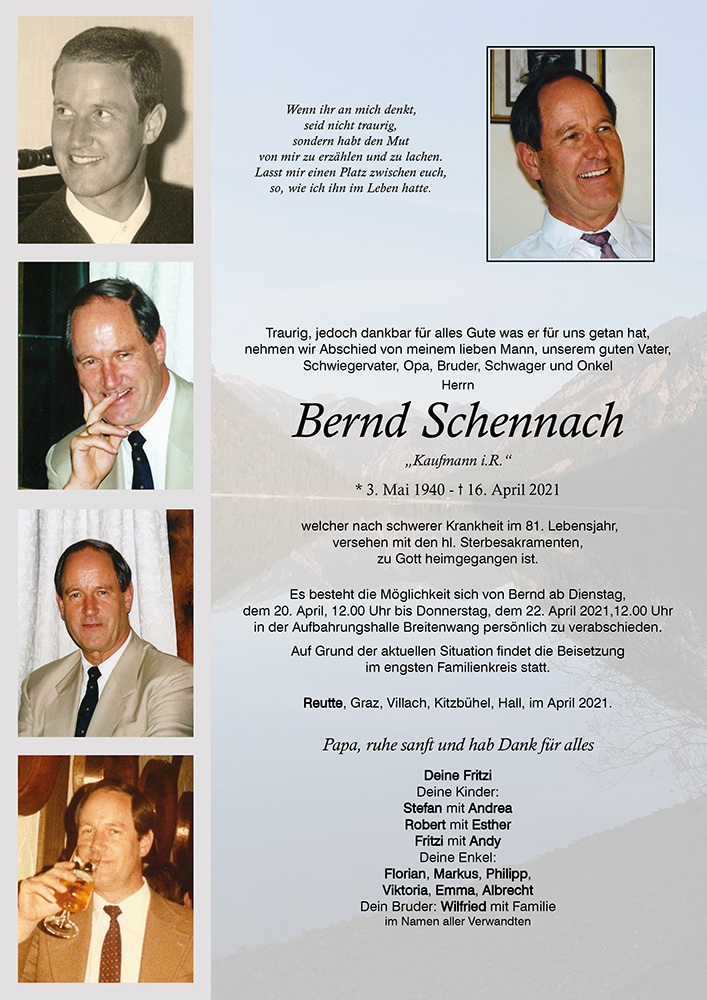 Ein wichtiger Mensch in meinem Leben, ein guter Freund,ein verlässlicher Geschäftspartner und ein edler Mensch hat uns verlassen. Servus und Danke Bernd.