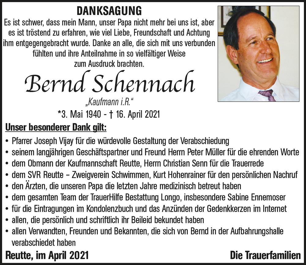 Den Trauernden erweise ich meine Anteilnahme. Dem Bernd, der jahrelang als Freund mit mir in der Kaufmannschaft tätig war, meinen hohe Anerkennung.