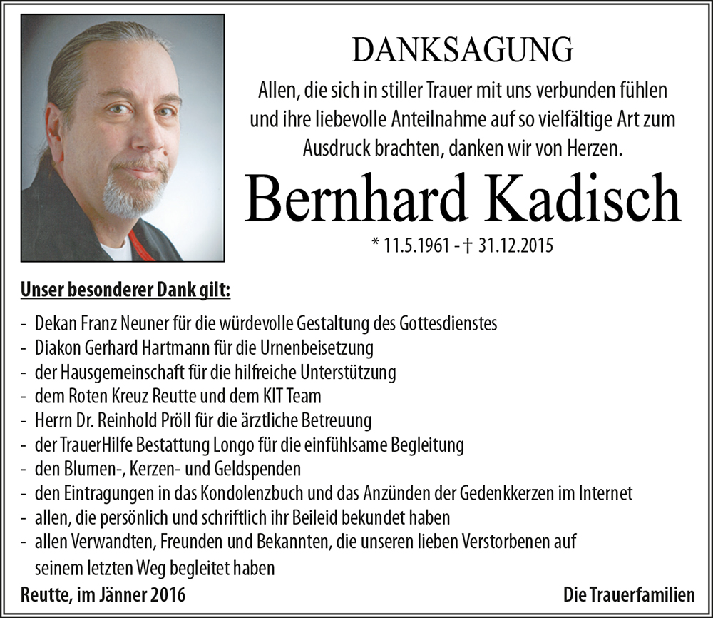 Bernhard, du warst immer da wenn man dich brauchte. Dein so früher Tot hat uns hart getroffen und uns um vieles Ärmer gemacht. Danke das ich dich kennen lernen durfte.