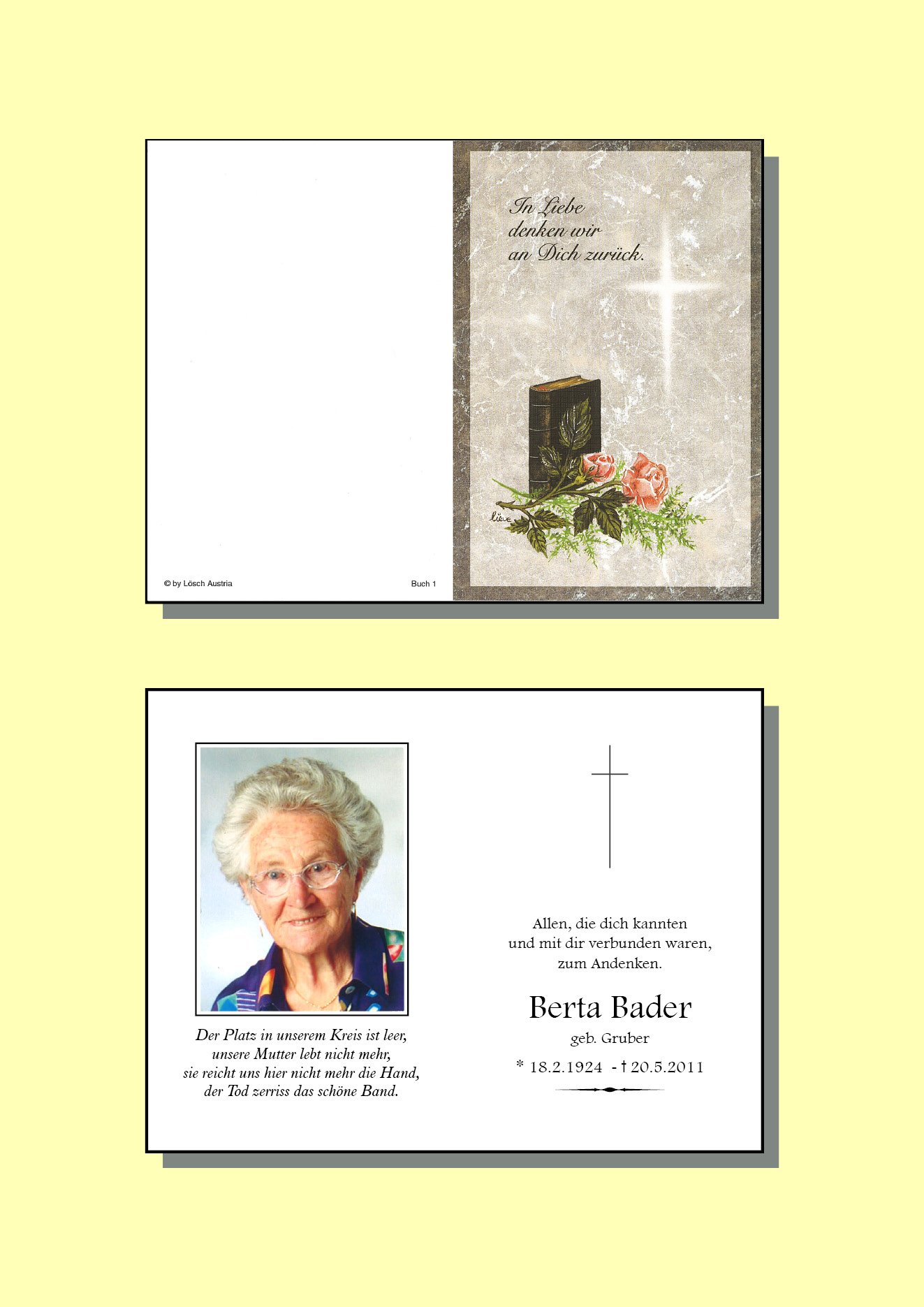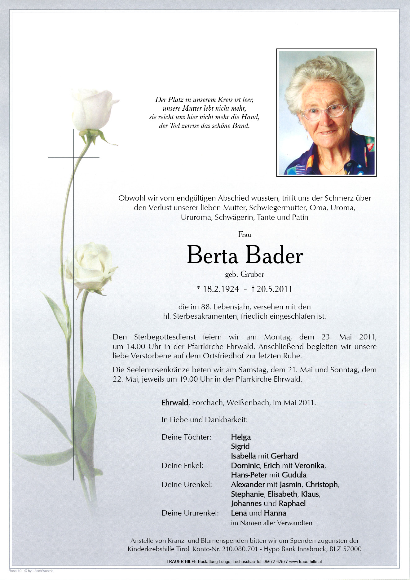 13.12.1901 20.05.2011 Ehrwald Berta Bader Action Parte Sterbebild Gedenkkerzen Kondolenzen Parte Sterbebild Gedenkkerzen Kondolenzen Parte herunterladen Sterbebild herunterladen Gedenkkerzen für Berta Bader 2 Einträge Kerze anzünden Fam. Prinz/ Somweber z. 1. J. Ged. Posch Bruno Wbch, Ihre Gedenkkerze fürBerta Bader Ihr Name* Farbe auswählen Ihre Nachricht oder Name* E-Mail-Adresse* Mit dem Klicken auf "Kerze anzünden" erklären Sie sich mit unseren Datenschutzbestimmungen einverstanden. Kondolenzbuch für Berta Bader 1 Eintrag Kondolenz verfassen Zum 1. Jahres - Gedenken ! Das Schönste was ein Mensch hinterlassen kann, ist ein Lächeln im Gesicht derjenigen, die an ihn denken,. Aufrichtige Anteilnahme Posch Bruno + Ingrid Wbch. 22.05.2012 um 08:08 Uhr Ihr Abschiedsgruß an Berta Bader Ihr Name* E-Mail-Adresse* Ihre Nachricht* Mit dem Klicken auf "Gruß absenden" erklären Sie sich mit unseren Datenschutzbestimmungen einverstanden.