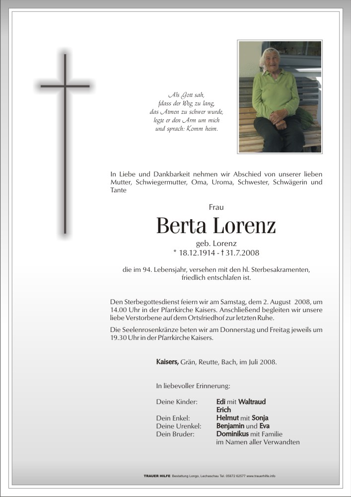 13.12.1901 31.07.2008 Kaisers Berta Lorenz Action Parte Gedenkkerzen Kondolenzen Parte Gedenkkerzen Kondolenzen Parte herunterladen Gedenkkerzen für Berta Lorenz 17 Einträge Kerze anzünden A Osterlichtla ✨ Unvergessen ✨ In lieber Erinnerung In lieber Erinnerung ✨ Denke immer noch oft an dich Es war immer schön bei dir In lieber Erinnerung A Weihnachtsliachtle für dich In lieber Erinnerung In lieber Erinnerung In lieber Erinnerung . . . habs fein im Himmel ! In lieber Erinnerung In lieber Erinnerung In lieber Erinnerung A Liachtle für di Das ewige Licht leuchte Dir Ihre Gedenkkerze fürBerta Lorenz Ihr Name* Farbe auswählen Ihre Nachricht oder Name* E-Mail-Adresse* Mit dem Klicken auf "Kerze anzünden" erklären Sie sich mit unseren Datenschutzbestimmungen einverstanden. Kondolenzbuch für Berta Lorenz 1 Eintrag Kondolenz verfassen Wir sind nur Gast auf Erden und wandern ohne Ruh‘ mit mancherlei Beschwerden der ewigen Heimat zu. Ruhe in Frieden 04.10.2020 um 18:22 Uhr Ihr Abschiedsgruß an Berta Lorenz Ihr Name* E-Mail-Adresse* Ihre Nachricht* Mit dem Klicken auf "Gruß absenden" erklären Sie sich mit unseren Datenschutzbestimmungen einverstanden.