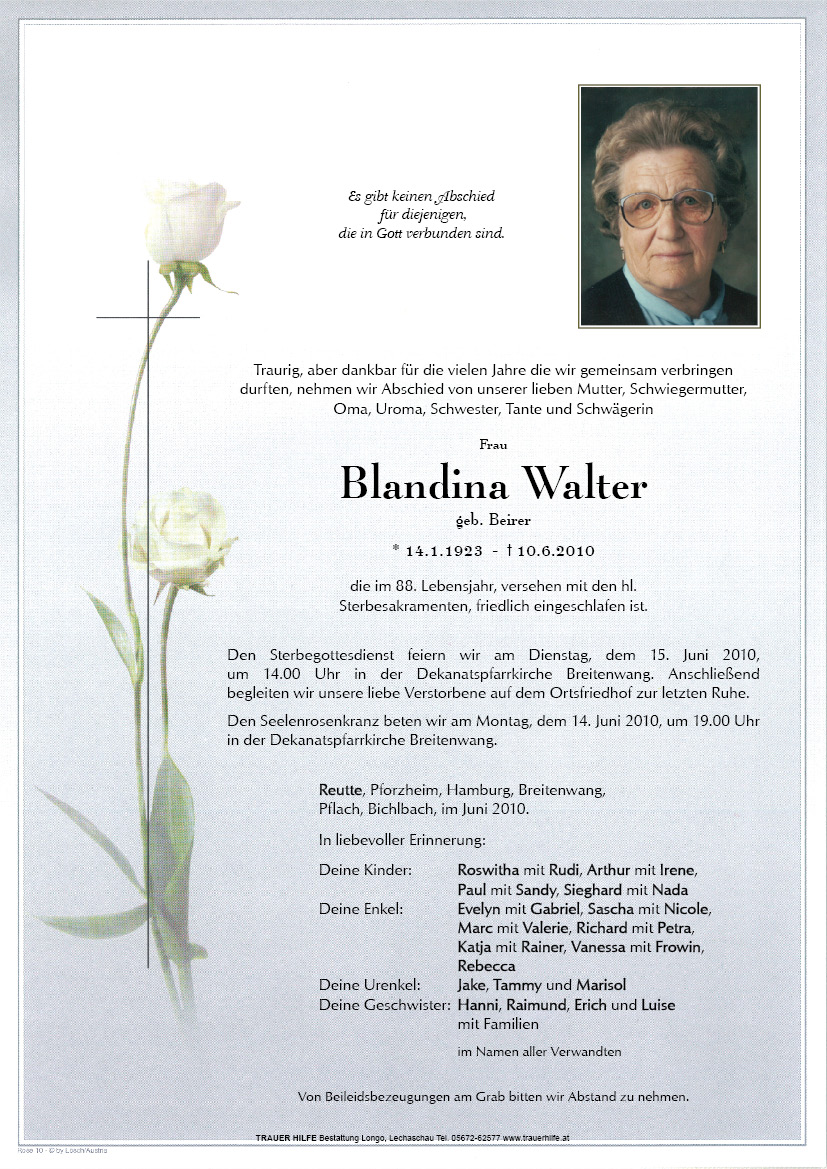 13.12.1901 10.06.2010 Reutte Blandina Walter Action Parte Sterbebild Gedenkkerzen Kondolenzen Danksagung Parte Sterbebild Gedenkkerzen Kondolenzen Danksagung Parte herunterladen Sterbebild herunterladen Gedenkkerzen für Blandina Walter 0 Einträge Kerze anzünden Ihre Gedenkkerze fürBlandina Walter Ihr Name* Farbe auswählen Ihre Nachricht oder Name* E-Mail-Adresse* Mit dem Klicken auf "Kerze anzünden" erklären Sie sich mit unseren Datenschutzbestimmungen einverstanden. Kondolenzbuch für Blandina Walter 0 Einträge Kondolenz verfassen Ihr Abschiedsgruß an Blandina Walter Ihr Name* E-Mail-Adresse* Ihre Nachricht* Mit dem Klicken auf "Gruß absenden" erklären Sie sich mit unseren Datenschutzbestimmungen einverstanden. Danksagung herunterladen