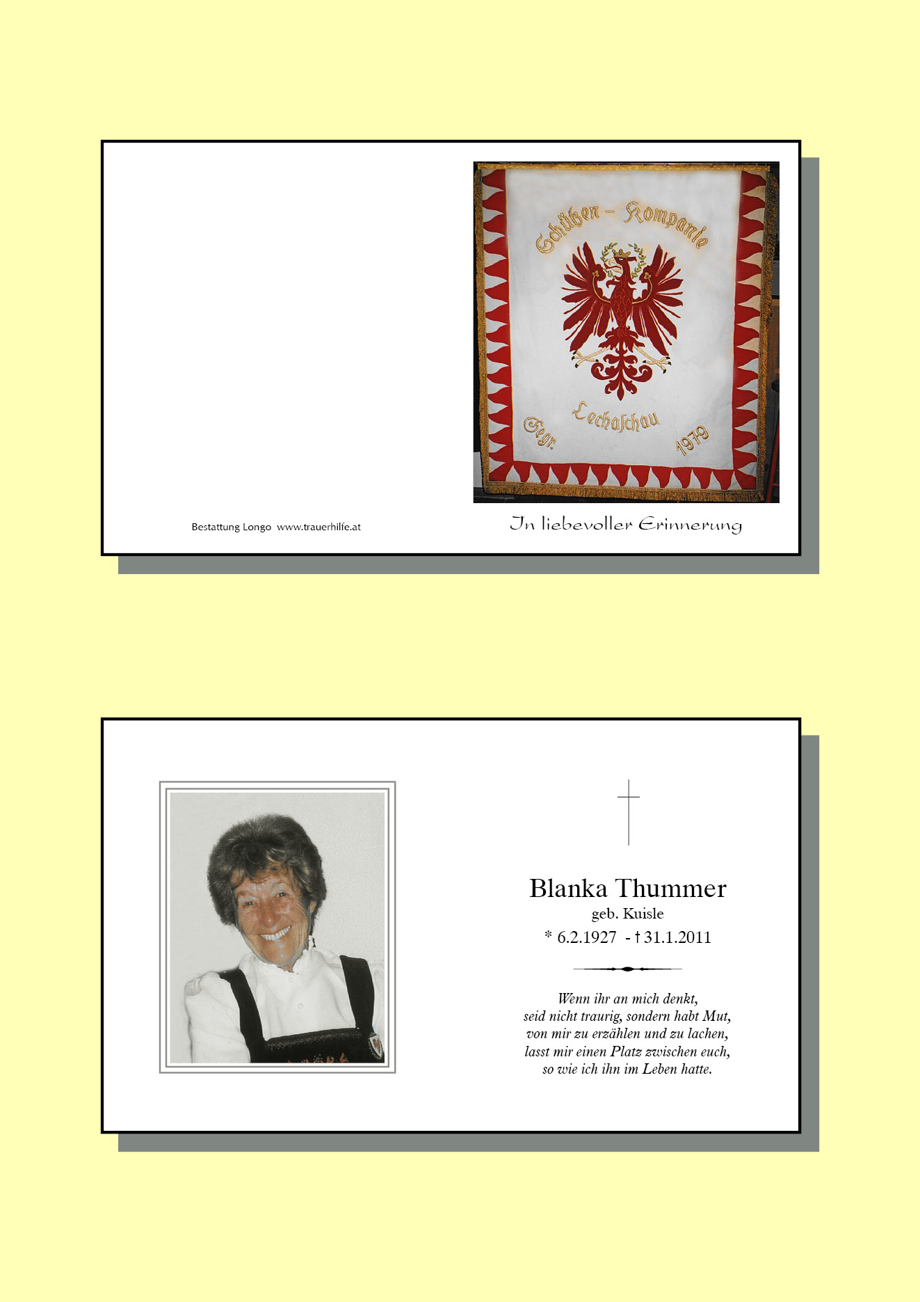 13.12.1901 31.01.2011 Pflach Blanka Thummer Action Parte Sterbebild Gedenkkerzen Kondolenzen Danksagung Parte Sterbebild Gedenkkerzen Kondolenzen Danksagung Parte herunterladen Sterbebild herunterladen Gedenkkerzen für Blanka Thummer 4 Einträge Kerze anzünden Gedenkkerze f. dich Marlen Sabine Fam. Georg Strasser thurner broll Ihre Gedenkkerze fürBlanka Thummer Ihr Name* Farbe auswählen Ihre Nachricht oder Name* E-Mail-Adresse* Mit dem Klicken auf "Kerze anzünden" erklären Sie sich mit unseren Datenschutzbestimmungen einverstanden. Kondolenzbuch für Blanka Thummer 0 Einträge Kondolenz verfassen Ihr Abschiedsgruß an Blanka Thummer Ihr Name* E-Mail-Adresse* Ihre Nachricht* Mit dem Klicken auf "Gruß absenden" erklären Sie sich mit unseren Datenschutzbestimmungen einverstanden. Danksagung herunterladen