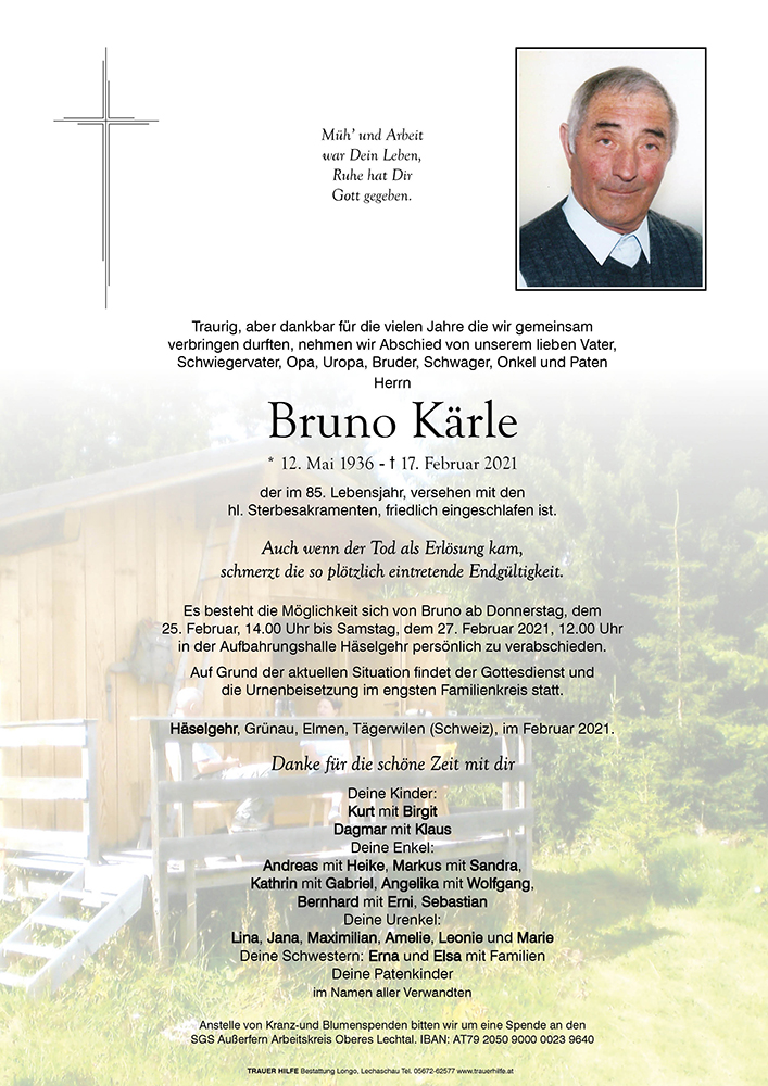 Liebe Dagmar und Kurt mit Familien, Vielleicht liegt ein kleiner Trost darin, dass Götti Bruno nun von seinem langen Leiden erlöst ist, auch wenn eures jetzt beginnt.