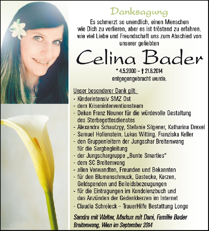 Lieber Gott! Ich weiss, dass unsere geliebte Celina, die von uns gegangen ist, jetzt bei dir im Himmel wohnt. Wir bitten dich, gut für sie zu sorgen, sodass deine Liebe sie trägt und inspiriert. Bitte schicke ihr zusätzliche Engel, die ihr helfen, sich auf wundervolle und glückliche Weise im Himmel einzugewöhnen. Bitte schicke auch Markus, Sandra und allen Trauernden zusätzliche Engel, die allen helfen, die Traurigkeit und den Schmerz zu lindern. Heile unsere schwermütigen Gefühle, damit wir zu dem Leben zurü ckkehren können,von dem wir wissen, dass Celina es sich für uns wünscht. Bitte sende uns ein Zeichen des Himmels, damit wir wissen, dass CELINA gut angekommen und bei dir geborgen ist.
