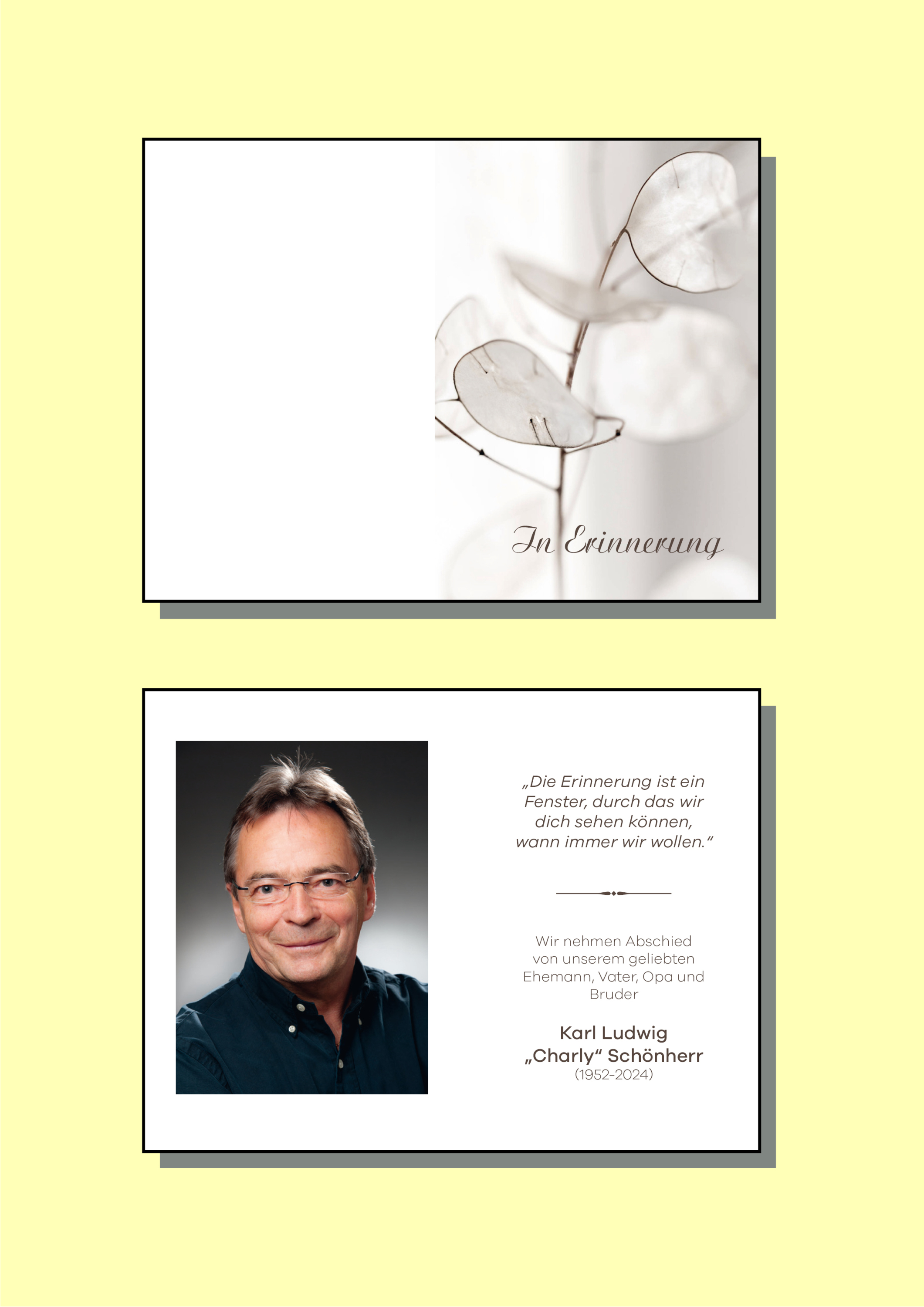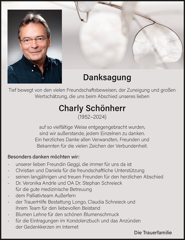 Wir möchten euch unsere aufrichtige Anteilnahme am Tode von Charly entbieten und wünschen in diesen schweren Stunden des Abschieds und der Trauer ganz viel Kraft. Mögen die vielen schönen, gemeinsamen Erinnerungen euch bald wieder ein Lächeln ins Gesicht zaubern und den großen Schmerz erleichtern.