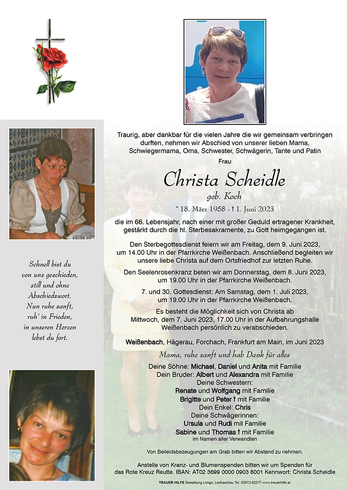 ich möchte dir zum schweren Verlust deiner lieben Schwester mein aufrichtiges Beileid mitteilen. Ich wünsche dir und deiner gesamten Familie viel Kraft in dieser schweren Zeit.