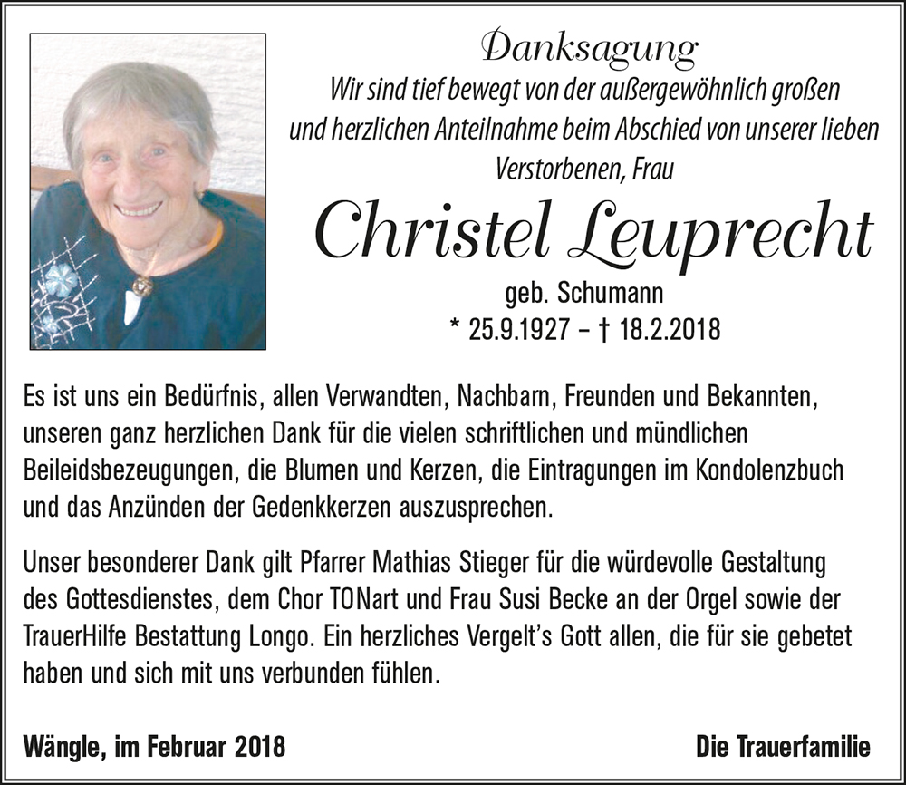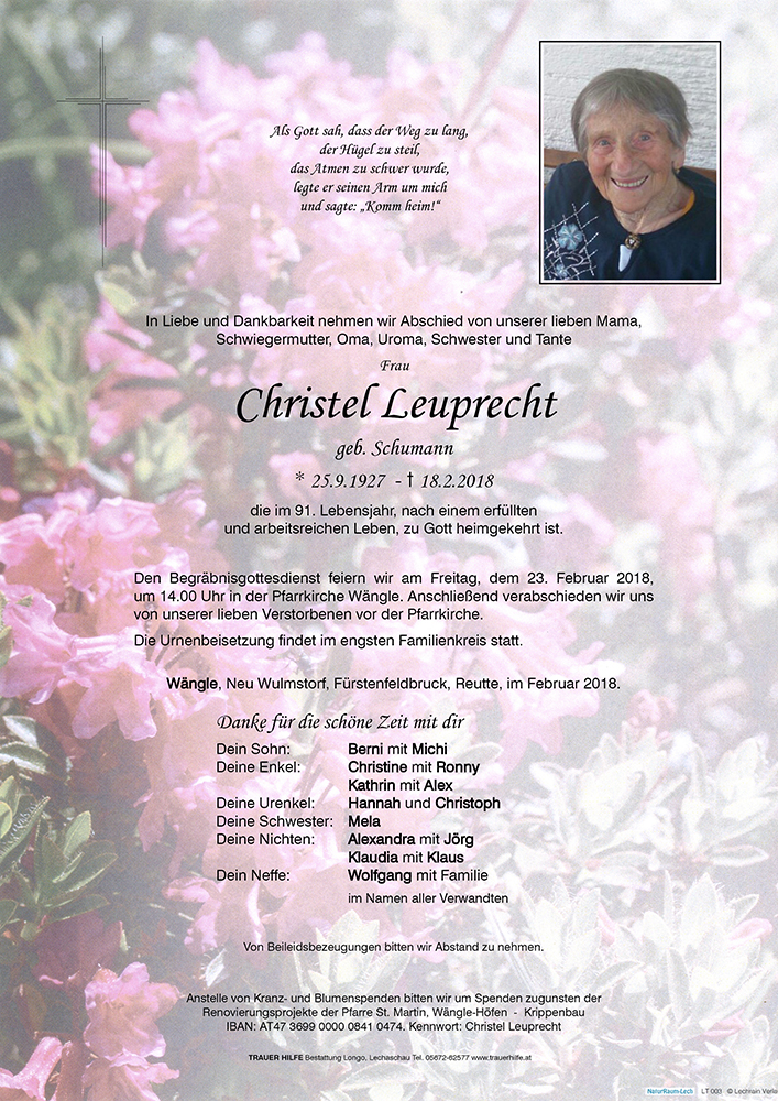 Wir wünschen Euch, dass die Personen der Erinnerung Euch durch diese schwere Zeit des Abschieds tragen, begleiten und trösten.