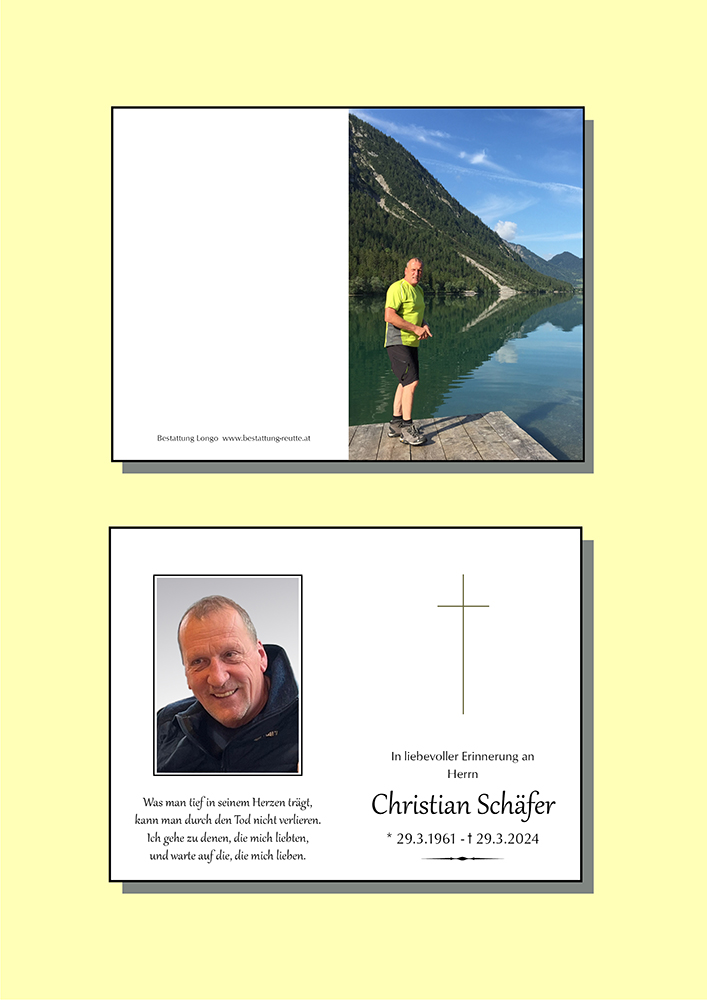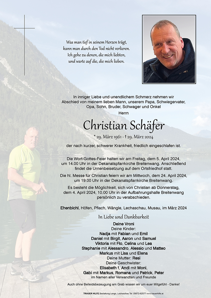 Liebe Vroni Liebe Trauerfamilie unendlich traurig über das Ableben von Christian. Ich habe ihn immer sehr geschätzt es war ein wunderbarer Mensch immer freundlich und jahrelang ein guter Freund . Mir fehlen die Worte die euch Trost spenden. Aber er bleibt für mich Unvergessen. Und in meinen Gebeten kann ich nur um Kraft in eurer schweren Zeit bitten.