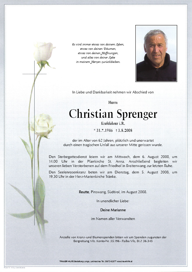 13.12.1901 03.08.2008 Reutte Christian Sprenger Action Parte Gedenkkerzen Kondolenzen Parte Gedenkkerzen Kondolenzen Parte herunterladen Gedenkkerzen für Christian Sprenger 7 Einträge Kerze anzünden R.i.p. Adolf Götsch Elmar Beirer ein Freund Elmar Beirer Elmar Beirer für Dich Ihre Gedenkkerze fürChristian Sprenger Ihr Name* Farbe auswählen Ihre Nachricht oder Name* E-Mail-Adresse* Mit dem Klicken auf "Kerze anzünden" erklären Sie sich mit unseren Datenschutzbestimmungen einverstanden. Kondolenzbuch für Christian Sprenger 0 Einträge Kondolenz verfassen Ihr Abschiedsgruß an Christian Sprenger Ihr Name* E-Mail-Adresse* Ihre Nachricht* Mit dem Klicken auf "Gruß absenden" erklären Sie sich mit unseren Datenschutzbestimmungen einverstanden.