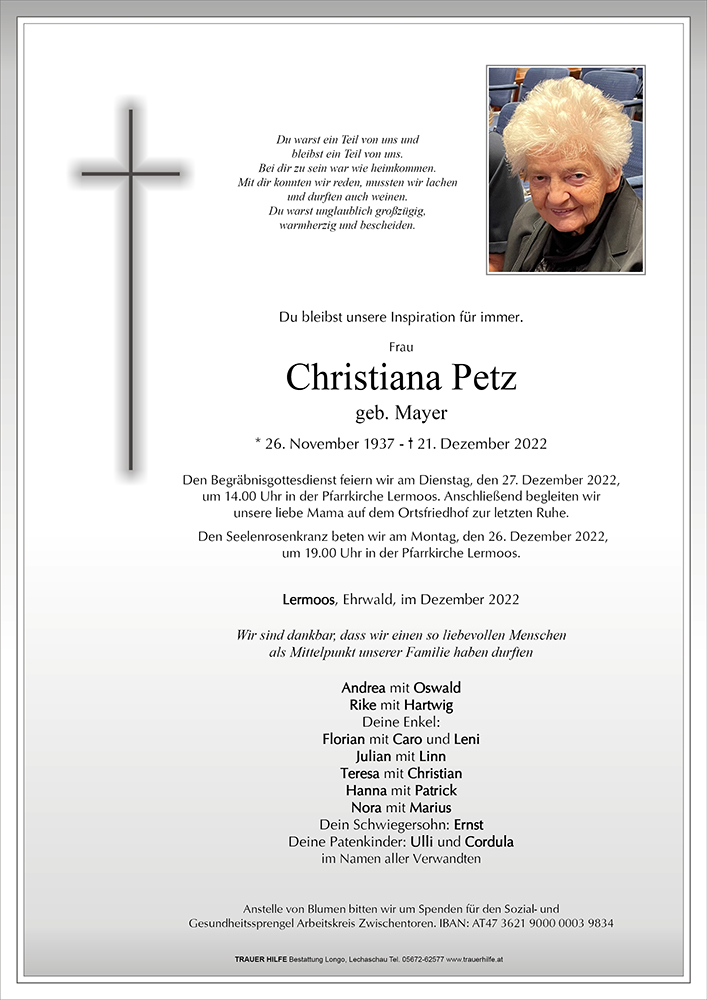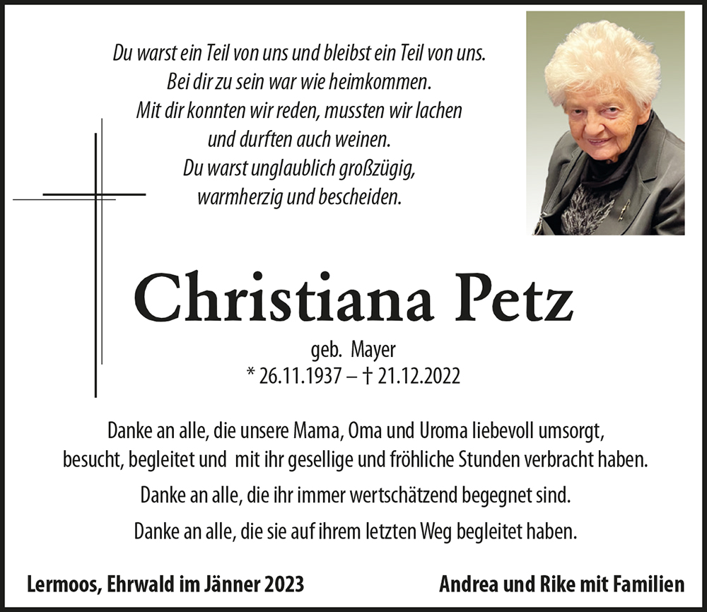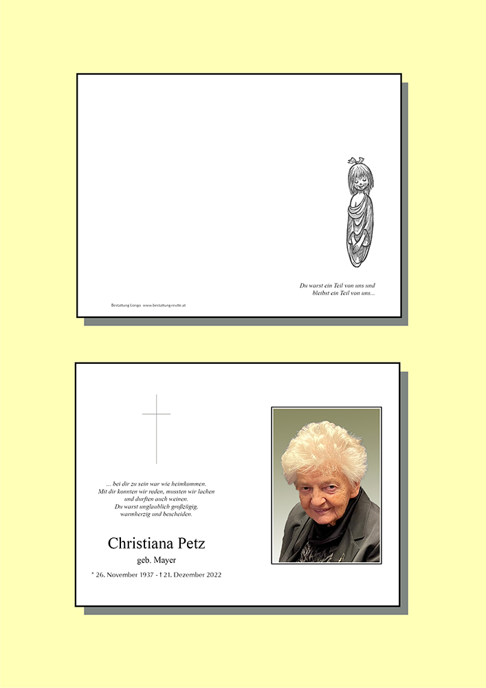 Die Nachricht das Frau Petz von uns gegangen ist hat mich schwer getroffen. Sie sagte mal zu mir in meiner Trauerfall das Oma mit Opa sicherlich Kartenspielen und das ist mir bi heute im Kopf geblieben. Jetzt fährt eure Liebe Oma, Mutter sicherlich Ski mit ihrem Mann.