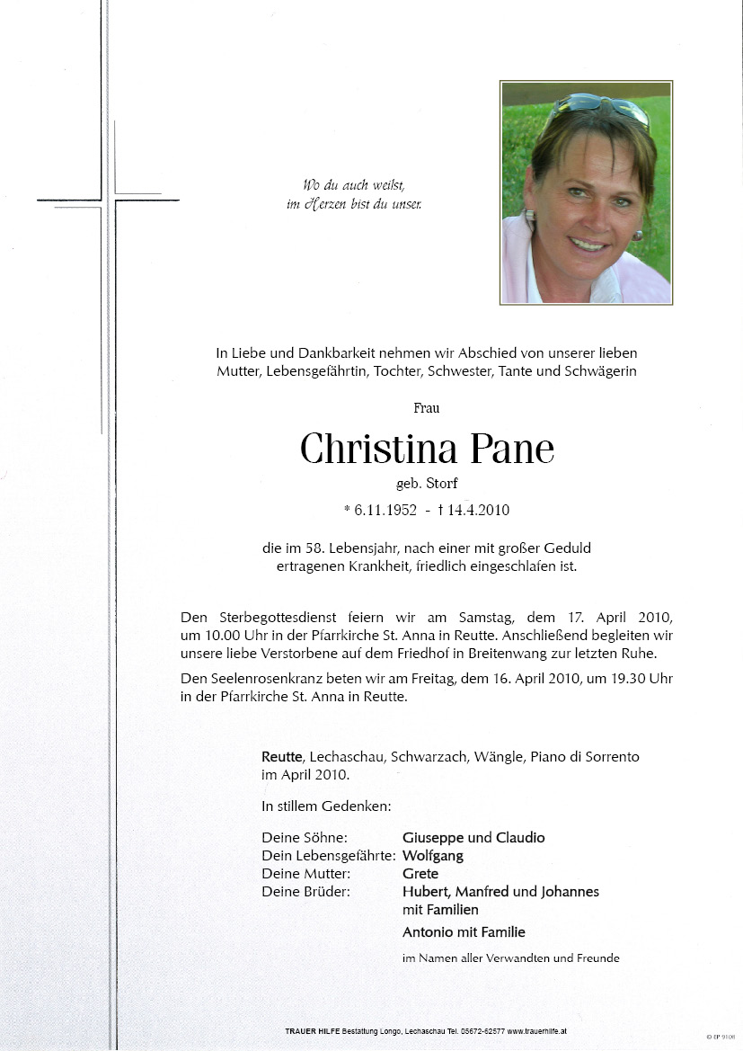 06.11.1952 14.04.2010 Reutte Christina Pane Action Parte Sterbebild Gedenkkerzen Kondolenzen Danksagung Parte Sterbebild Gedenkkerzen Kondolenzen Danksagung Parte herunterladen Sterbebild herunterladen Gedenkkerzen für Christina Pane 2 Einträge Kerze anzünden ein Licht für dich Ruhe in Frieden Ihre Gedenkkerze fürChristina Pane Ihr Name* Farbe auswählen Ihre Nachricht oder Name* E-Mail-Adresse* Mit dem Klicken auf "Kerze anzünden" erklären Sie sich mit unseren Datenschutzbestimmungen einverstanden. Kondolenzbuch für Christina Pane 0 Einträge Kondolenz verfassen Ihr Abschiedsgruß an Christina Pane Ihr Name* E-Mail-Adresse* Ihre Nachricht* Mit dem Klicken auf "Gruß absenden" erklären Sie sich mit unseren Datenschutzbestimmungen einverstanden. Danksagung herunterladen