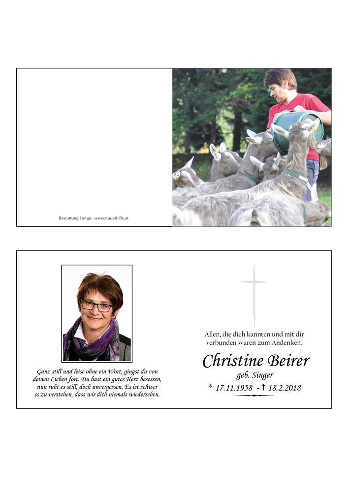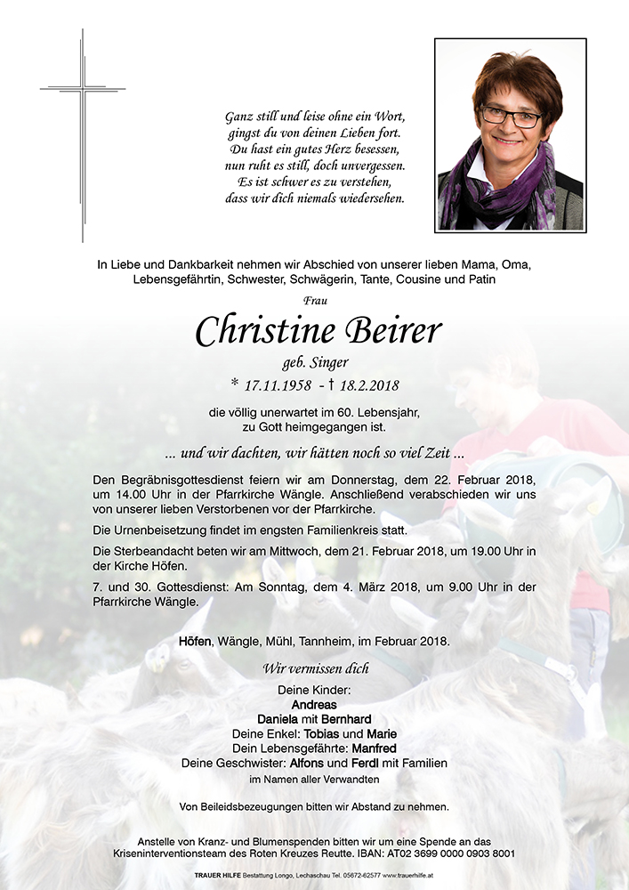 Lieber Manfred, liebe Familie Beierer, für uns unfassbar haben wir vom plötzlichen Tod von Christl gehört. Durch unsere Ziegenzucht und die Liebe zu diesen Tieren hatten wir das Glück Christl kennenlernen zu dürfen. Sie war stets hilfsbereit und wir haben so manchen guten Rat von ihr bekommen. Uns wird Christl mit ihrer aufgeschlossenen und liebenswerten Art sehr fehlen. Wir wünschen euch viel Kraft in diesen schweren Stunden. Unsere Gedanken sind bei euch.