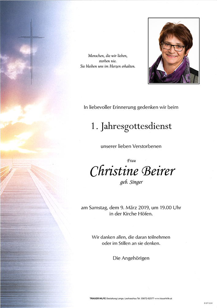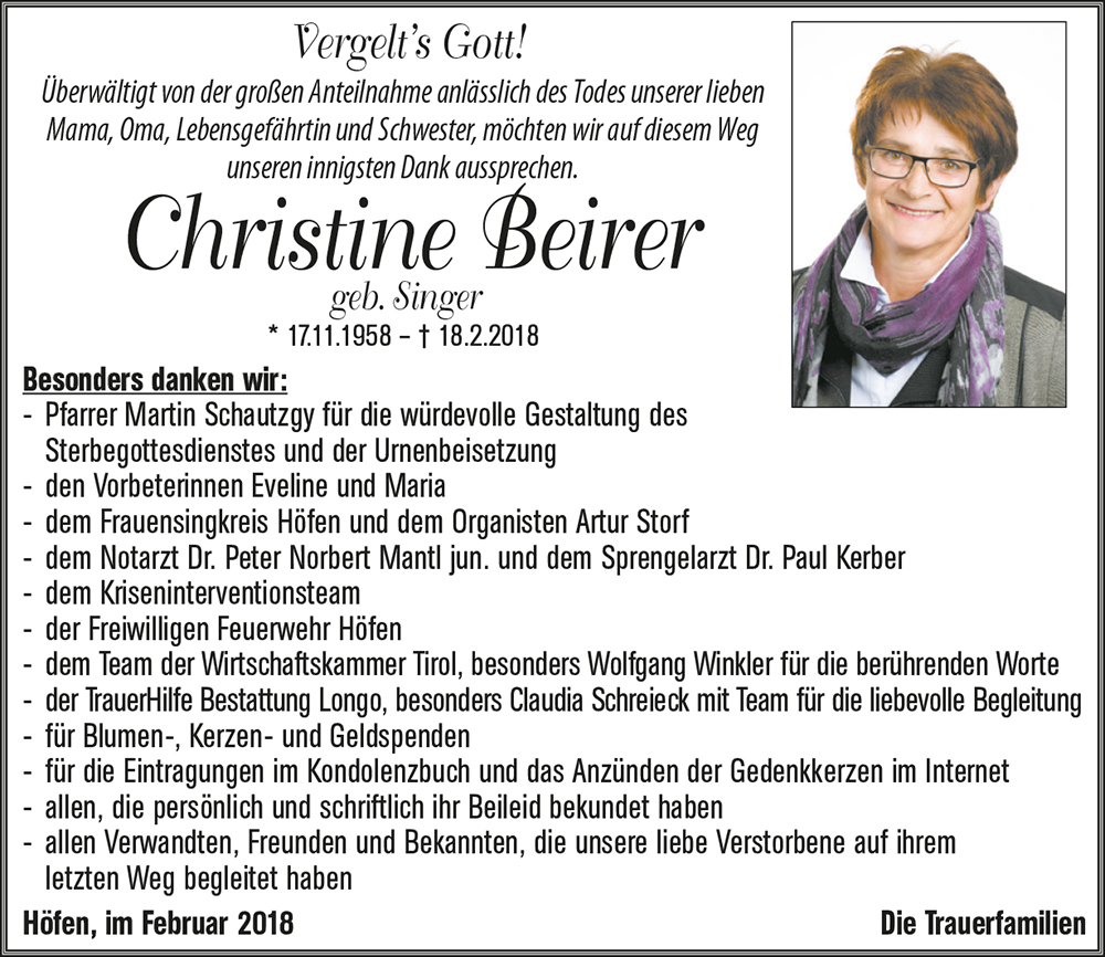 Vor einigen Tagen hatte ich noch ein sehr schönes Gespräch mit Fr.Beirer, mußte des öfteren ihre Hilfe in Anspruch nehmen und die verlief immer sehr hilfreich und positiv und die feine Art werde ich nie vergessen.Es tut mir sehr sehr leid um eure geliebte Mama.Unser aufrichtiges Beileid!