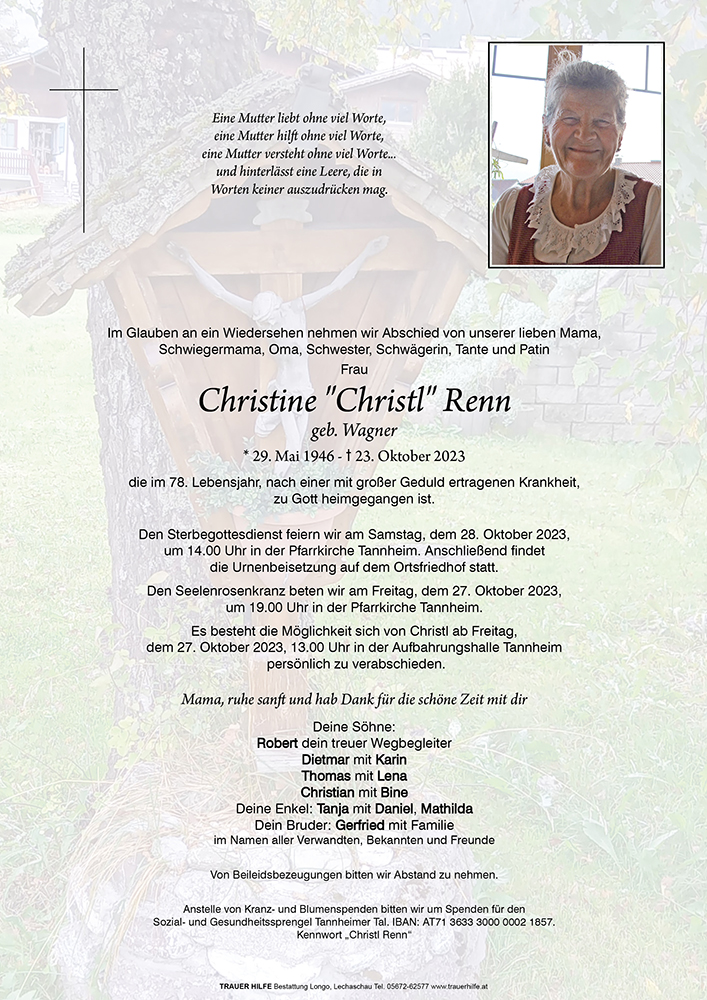 Wir entbieten Euch unser tiefes Mitgefühl und Beileid und wünschen Euch viel Kraft und Zuversicht zum Abschied Eurer lieben Mama. Möge der Herrgott Ihr alles was sie in Ihrem Leben für Euch und ihre Mitmenschen bewirkt hat, reichlich lohnen.
