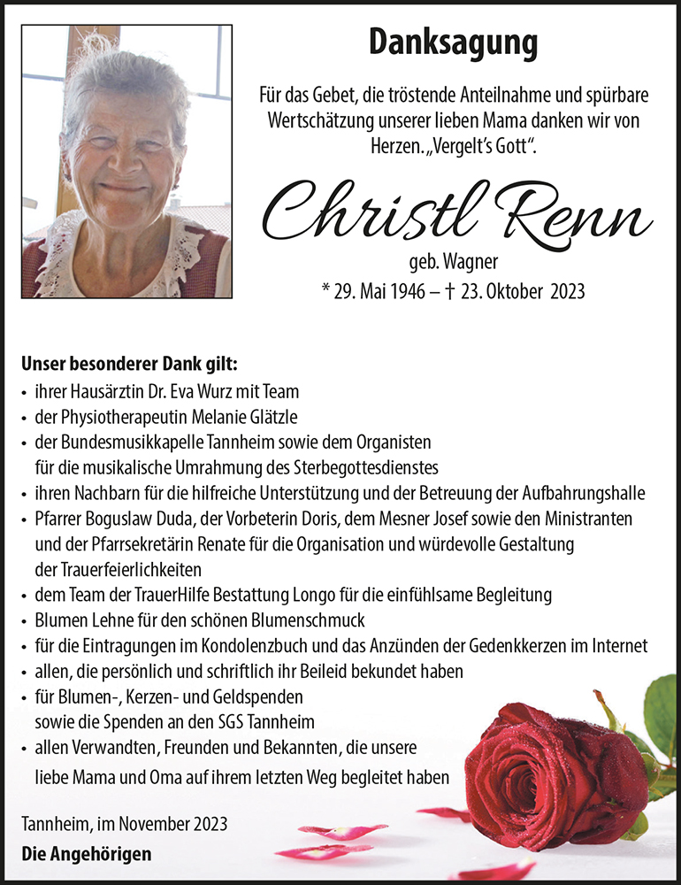 Zum Verlust von Eurer lieben Christl möchten wir Euch unser aufrichtiges Beileid und tiefes Mitgefühl ausdrücken.