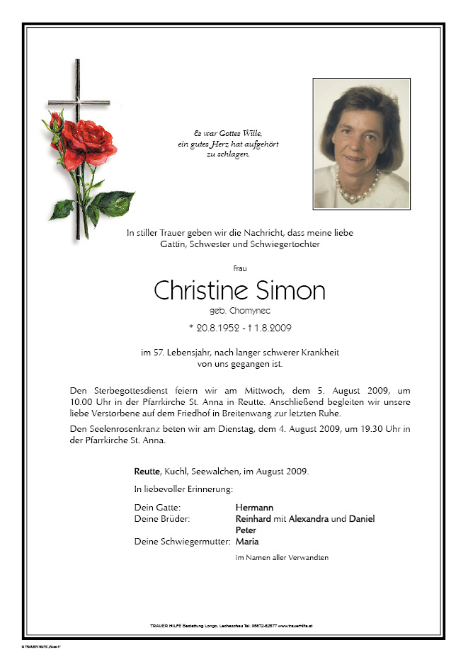 13.12.1901 01.08.2009 Reutte Christine Simon Action Parte Gedenkkerzen Kondolenzen Parte Gedenkkerzen Kondolenzen Parte herunterladen Gedenkkerzen für Christine Simon 22 Einträge Kerze anzünden Für dich und deine Familie A Osterkerzl für di und dei Familie Erinnerung im Herzen bleiben-Christine Perle Erinnerung im Herzen bleiben-Christine Perle Erinnerung im Herzen bleiben-Christine Perle Erinnerung im Herzen bleiben-Christine Perle Erinnerung im Herzen bleiben-Christine Perle Erinnerung im Herzen bleiben-Christine Perle Erinnerung im Herzen bleiben-Christine Perle Reinhard Reinhard Reinhard & Alexandra Reinhard & Alexandra Reinhard & Alexandra Ruhe in Frieden Reinhard Reinhard + Alexandra Reinhard + Alexandra Reinhard & Alexandra Christine Christine Christine Ihre Gedenkkerze fürChristine Simon Ihr Name* Farbe auswählen Ihre Nachricht oder Name* E-Mail-Adresse* Mit dem Klicken auf "Kerze anzünden" erklären Sie sich mit unseren Datenschutzbestimmungen einverstanden. Kondolenzbuch für Christine Simon 0 Einträge Kondolenz verfassen Ihr Abschiedsgruß an Christine Simon Ihr Name* E-Mail-Adresse* Ihre Nachricht* Mit dem Klicken auf "Gruß absenden" erklären Sie sich mit unseren Datenschutzbestimmungen einverstanden.