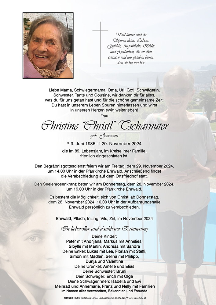 Wir möchten euch unsere tiefe Anteilnahme zum Heimgang von eurer Mama, Schiegermama, Oma und Uroma mitteilen und viel Kraft für die schwierige Zeit wünschen. Ihre Liebe bleibt! In stiller Anteilnahme Patricia und Markus, sowie unsere Familien vom Ehrwalderhof und Schönruh