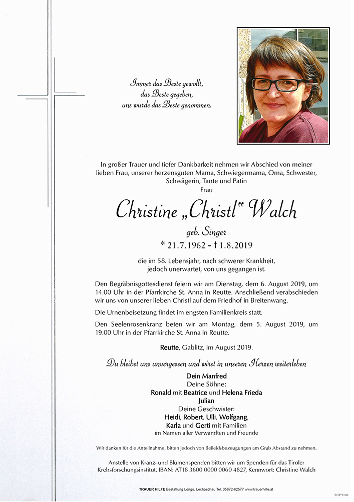 Lieber Mani, lieber Julian und Ronald !! Es gibt Menschen, die machen unsere Welt zu etwas ganz Besonderem, einfach nur weil es sie gibt !! Unsere Christl war so was Besonderes , sie fehlt uns so sehr !! Wir sind sehr, sehr traurig aber doch dankbar für die vielen schönen Stunden, Tage und Jahre , die wir gemeinsam Verbracht haben !! In ewiger Freundschaft Gabi und Lukas mit Familie ❤️