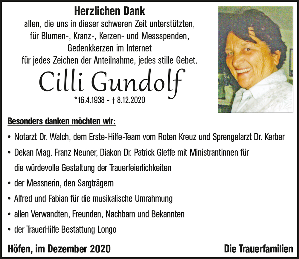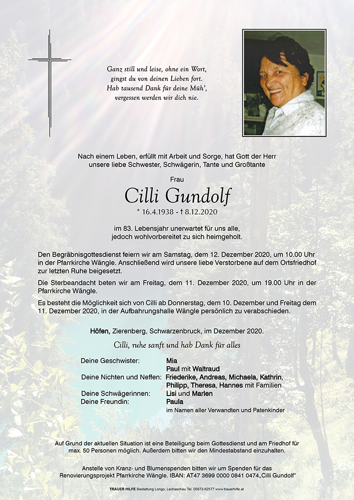 Liebe Trauerfamilie, Cilli war uns so vertraut und hat uns mit ihren lieben Art immer ein lächeln auf die Lippen gelegt. Gern war sie in Zierenberg, so auch letztes Jahr Weihnachten. Die Erinnerungen an gemeinsame schöne Stunden werden unendlich in unseren Herzen sein. Aufrichtige Anteilnahme