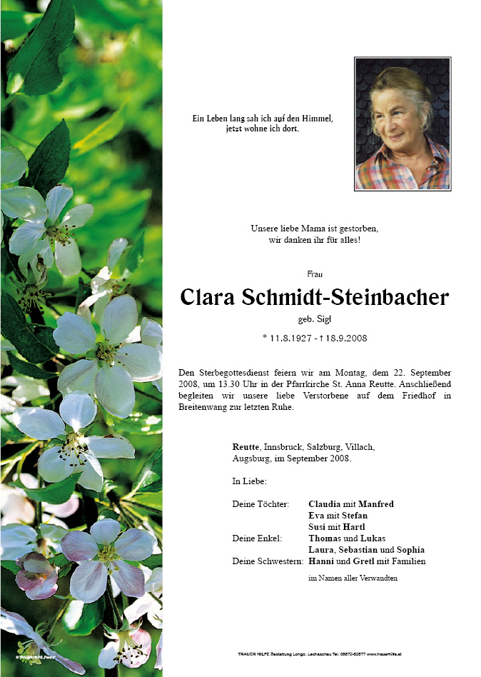 13.12.1901 18.09.2008 Reutte Clara Schmidt-Steinbacher Action Parte Gedenkkerzen Kondolenzen Parte Gedenkkerzen Kondolenzen Parte herunterladen Gedenkkerzen für Clara Schmidt-Steinbacher 1 Eintrag Kerze anzünden Fam. Günter und Gitti Muglach Ihre Gedenkkerze fürClara Schmidt-Steinbacher Ihr Name* Farbe auswählen Ihre Nachricht oder Name* E-Mail-Adresse* Mit dem Klicken auf "Kerze anzünden" erklären Sie sich mit unseren Datenschutzbestimmungen einverstanden. Kondolenzbuch für Clara Schmidt-Steinbacher 0 Einträge Kondolenz verfassen Ihr Abschiedsgruß an Clara Schmidt-Steinbacher Ihr Name* E-Mail-Adresse* Ihre Nachricht* Mit dem Klicken auf "Gruß absenden" erklären Sie sich mit unseren Datenschutzbestimmungen einverstanden.