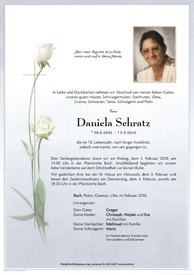 13.12.1901 02.02.2010 Bach Daniela Schratz Action Parte Sterbebild Gedenkkerzen Kondolenzen Parte Sterbebild Gedenkkerzen Kondolenzen Parte herunterladen Sterbebild herunterladen Gedenkkerzen für Daniela Schratz 1 Eintrag Kerze anzünden . . . habs fein im Himmel ! Ihre Gedenkkerze fürDaniela Schratz Ihr Name* Farbe auswählen Ihre Nachricht oder Name* E-Mail-Adresse* Mit dem Klicken auf "Kerze anzünden" erklären Sie sich mit unseren Datenschutzbestimmungen einverstanden. Kondolenzbuch für Daniela Schratz 0 Einträge Kondolenz verfassen Ihr Abschiedsgruß an Daniela Schratz Ihr Name* E-Mail-Adresse* Ihre Nachricht* Mit dem Klicken auf "Gruß absenden" erklären Sie sich mit unseren Datenschutzbestimmungen einverstanden.