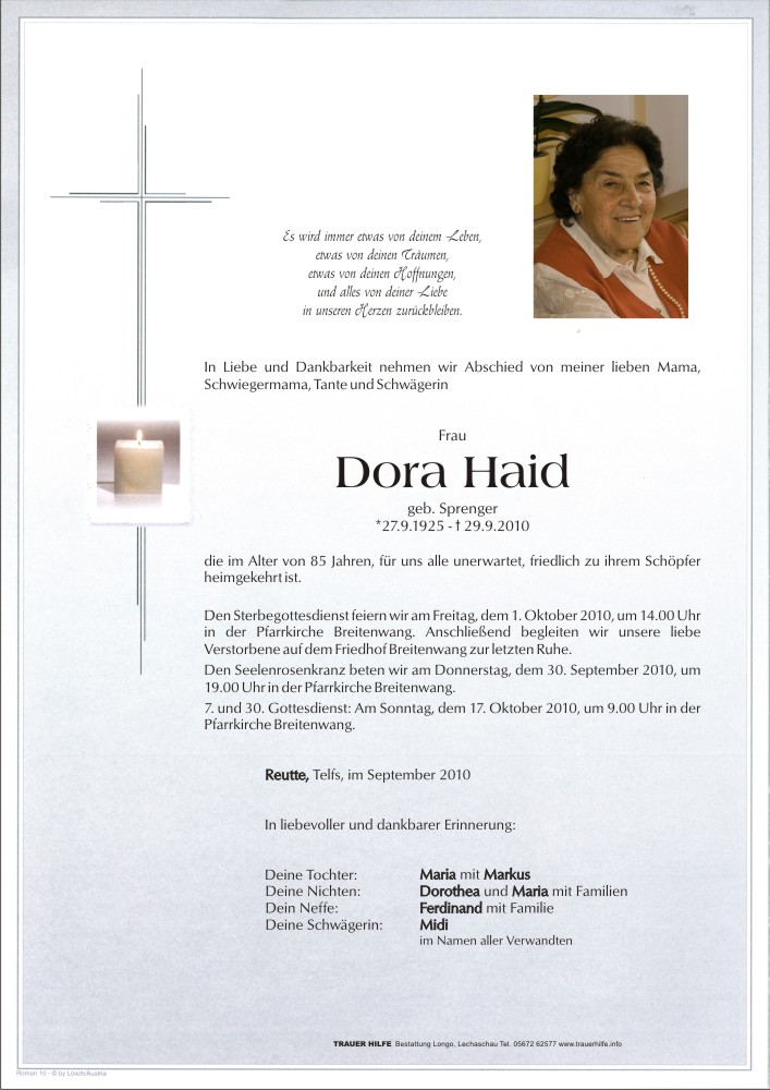 13.12.1901 29.09.2010 Breitenwang Dora Haid Action Parte Sterbebild Gedenkkerzen Kondolenzen Parte Sterbebild Gedenkkerzen Kondolenzen Parte herunterladen Sterbebild herunterladen Gedenkkerzen für Dora Haid 0 Einträge Kerze anzünden Ihre Gedenkkerze fürDora Haid Ihr Name* Farbe auswählen Ihre Nachricht oder Name* E-Mail-Adresse* Mit dem Klicken auf "Kerze anzünden" erklären Sie sich mit unseren Datenschutzbestimmungen einverstanden. Kondolenzbuch für Dora Haid 0 Einträge Kondolenz verfassen Ihr Abschiedsgruß an Dora Haid Ihr Name* E-Mail-Adresse* Ihre Nachricht* Mit dem Klicken auf "Gruß absenden" erklären Sie sich mit unseren Datenschutzbestimmungen einverstanden.