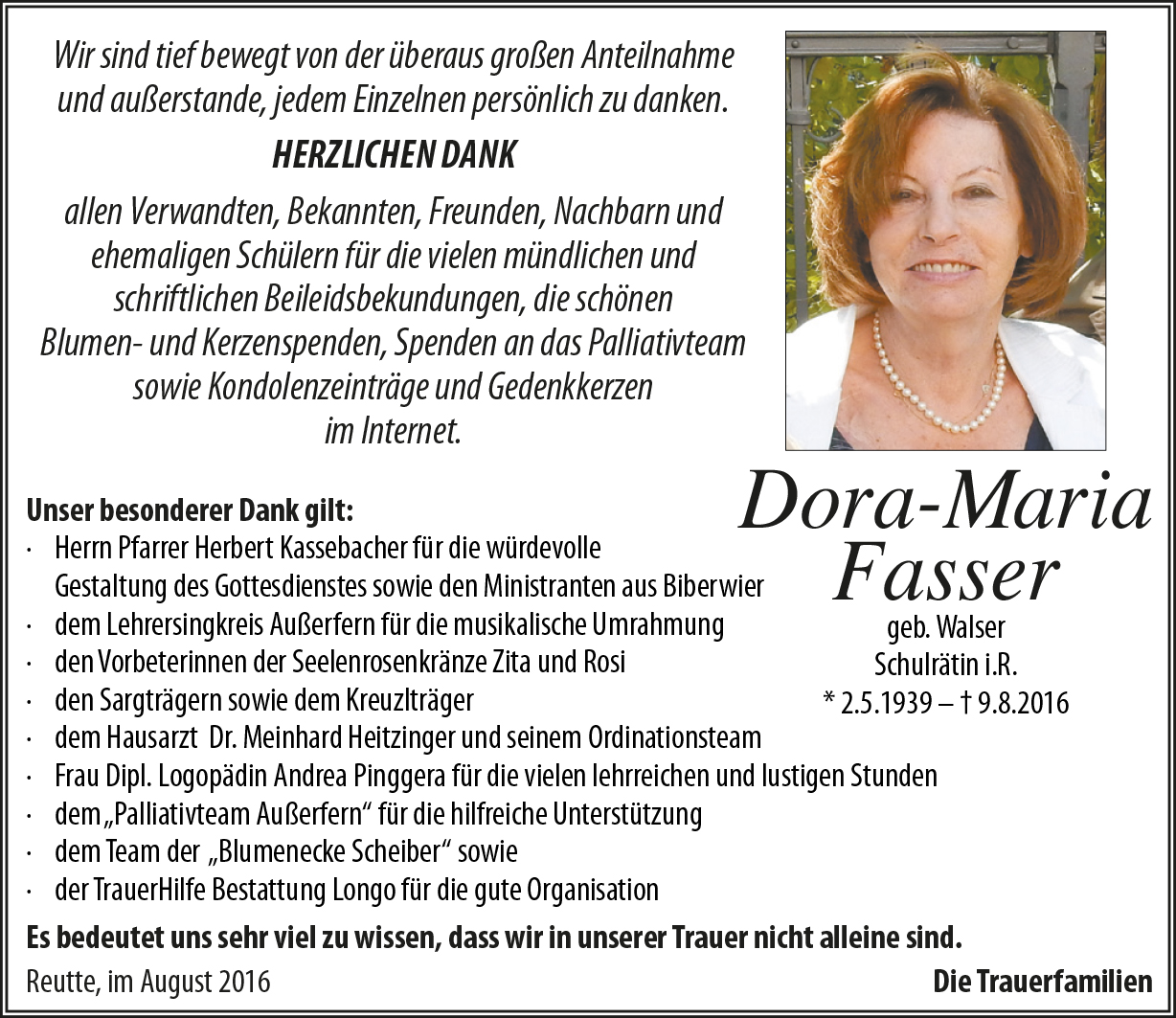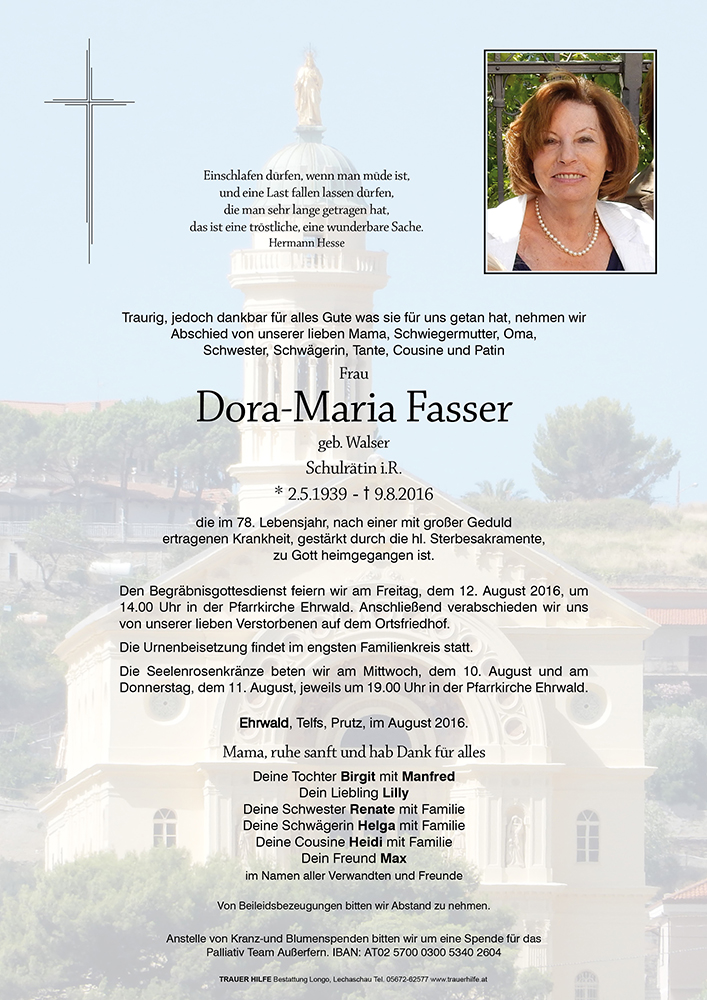 Meine Mama hatte Dora immer sehr gerne und hat sie sehr geschätzt, sie haben gemeinsam studiert. Gerne erinnere auch ich mich an einen Besuch von euch beiden , als wir noch Kinder waren und weiss noch wie sehr sich meine Mama darüber gefreut hat. Im Juli 2004 ist meine Mama gestorben, beim Begräbnis habe ich Dora das letzte mal gesehen. Ich werde in der Wallfahrtskirche Kaltenbrunn eine Kerze für Dora entzünden, in Erinnerung an eine sehr sympatische, warmherzige und zuvorkommende Frau .