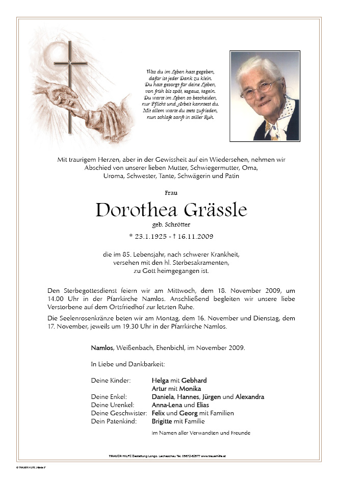 13.12.1901 16.11.2009 Namlos Dorothea Grässle Action Parte Gedenkkerzen Kondolenzen Parte Gedenkkerzen Kondolenzen Parte herunterladen Gedenkkerzen für Dorothea Grässle 8 Einträge Kerze anzünden Alles Gute zum Geburtstag ?️ Ruhe sanft in Gottes Hand! Ein LICHT für die EWIGKEIT! Ein Licht zum Jahrestags-Gedenken Ruhe sanft in Gottes Hand! Ein Licht für die Ewigkeit! ♡ ein Licht für dich aus Reutte Ihre Gedenkkerze fürDorothea Grässle Ihr Name* Farbe auswählen Ihre Nachricht oder Name* E-Mail-Adresse* Mit dem Klicken auf "Kerze anzünden" erklären Sie sich mit unseren Datenschutzbestimmungen einverstanden. Kondolenzbuch für Dorothea Grässle 0 Einträge Kondolenz verfassen Ihr Abschiedsgruß an Dorothea Grässle Ihr Name* E-Mail-Adresse* Ihre Nachricht* Mit dem Klicken auf "Gruß absenden" erklären Sie sich mit unseren Datenschutzbestimmungen einverstanden.