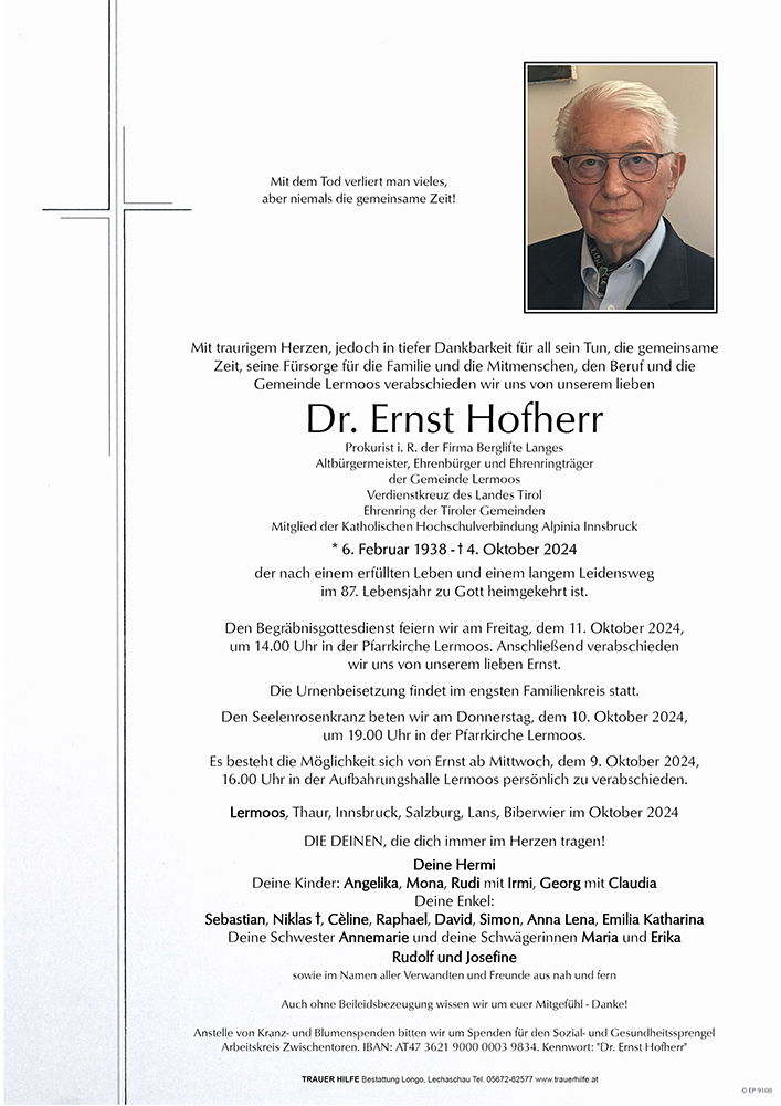 Mit tiefer Betroffenheit und Trauer müssen wir zur Kenntnis nehmen dass mein langjähriger Freund und Bürgermeisterkollege zu Gott heim gegangen ist. Ernst war mir immer unterstützend und helfend als Freund zur Seite.