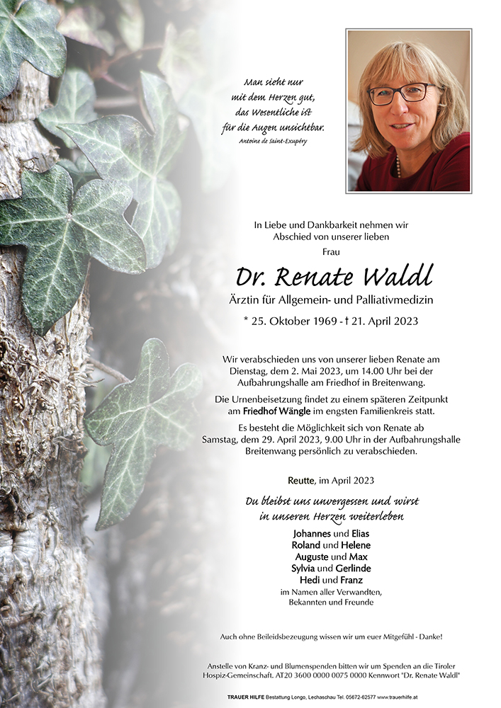 sich von einem herzensguten und engagierten Menschen für immer verabschieden zu müssen, hinterlässt offene Fragen, die unbeantwortet bleiben. Unvergessen bleibt in unserer Erinnerung, wie Renate bei der Bruderschaftsversammlung in Bichlbach den Sozialpreis „Dach der St. Josefsbruderschaft“ 2017, stellvertretend für das Palliativteam Außerfern entgegennehmen durfte. Wir werden Renate in besonderer Erinnerung behalten und ihr ein ehrendes Andenken bewahren.