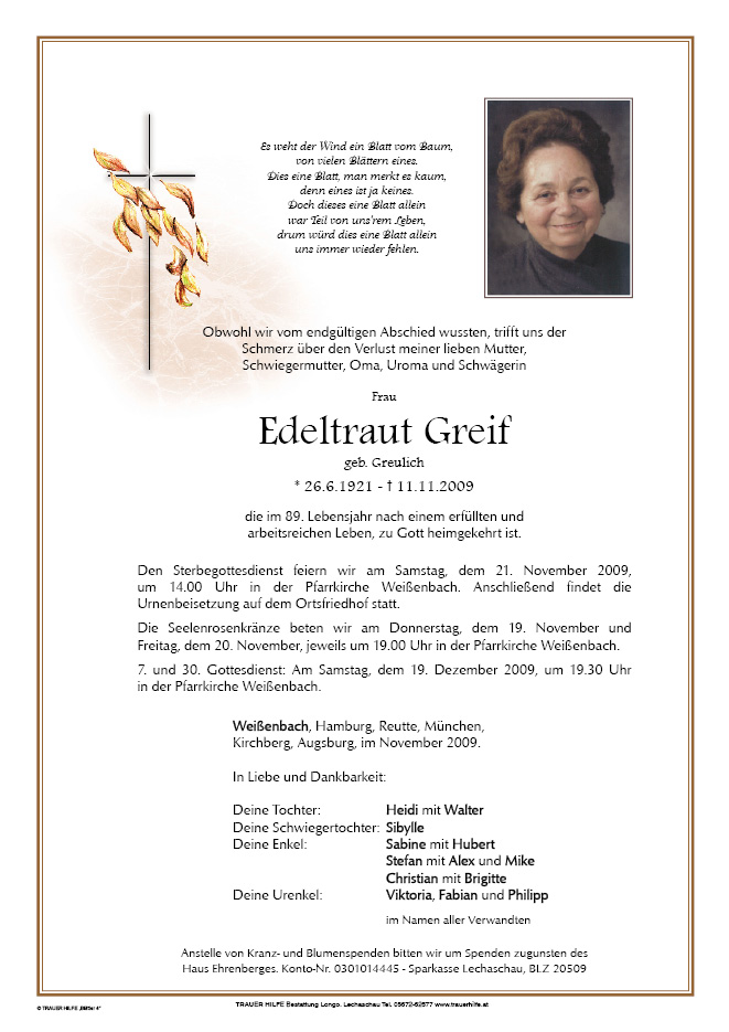 13.12.1901 11.11.2009 Weißenbach am Lech Edeltraut Greif Action Parte Gedenkkerzen Kondolenzen Parte Gedenkkerzen Kondolenzen Parte herunterladen Gedenkkerzen für Edeltraut Greif 2 Einträge Kerze anzünden Bruno + Ingrid Posch Wch. Ingrid Posch Wbch. Ihre Gedenkkerze fürEdeltraut Greif Ihr Name* Farbe auswählen Ihre Nachricht oder Name* E-Mail-Adresse* Mit dem Klicken auf "Kerze anzünden" erklären Sie sich mit unseren Datenschutzbestimmungen einverstanden. Kondolenzbuch für Edeltraut Greif 0 Einträge Kondolenz verfassen Ihr Abschiedsgruß an Edeltraut Greif Ihr Name* E-Mail-Adresse* Ihre Nachricht* Mit dem Klicken auf "Gruß absenden" erklären Sie sich mit unseren Datenschutzbestimmungen einverstanden.