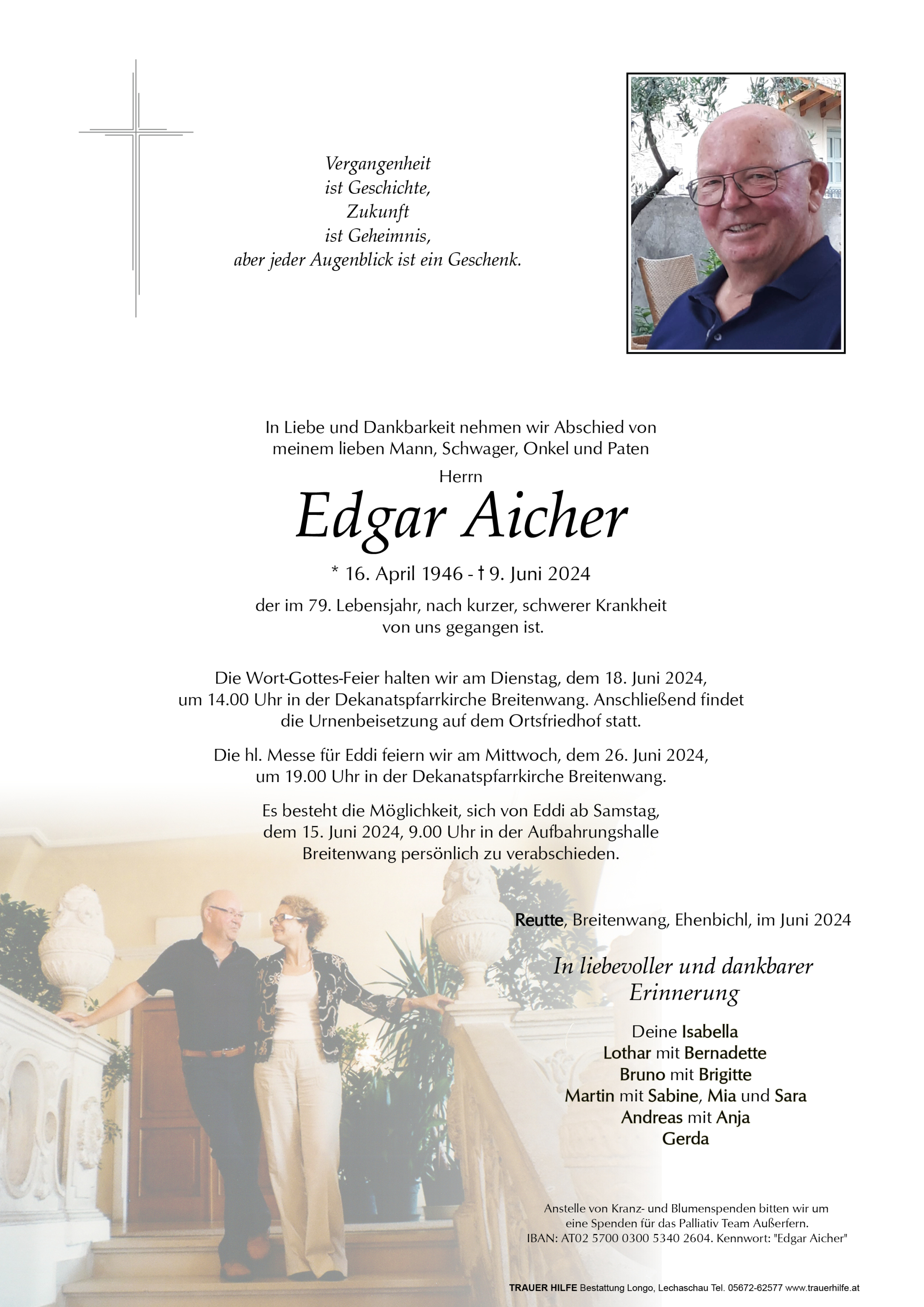 In tiefer Betroffenheit möchte ich dir auf diesem Wege mein aufrichtiges Beileid entbieten. Ich durfte deinen lieben Eddi vor vielen Jahren kennenlernen und die gelegentlichen Gespräche mit ihm werden mir durch seine feine und offene Art in ewiger Erinnerung bleiben. Mögen auch deine schönen Erinnerungen an ihn dir in der schweren Zeit der Trauer und des Loslassens Kraft und Trost spenden.