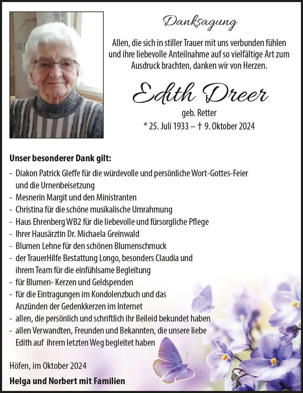 Aufrichtige Anteilnahme am Heimgang eurer lieben Edith entbietet euch herzlichst