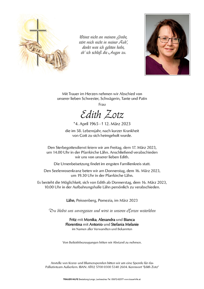 Ich wünsche den Hinterbliebenen von ganzem Herzen für die Zukunft viel Kraft. Zuversicht und Gottvertrauen.