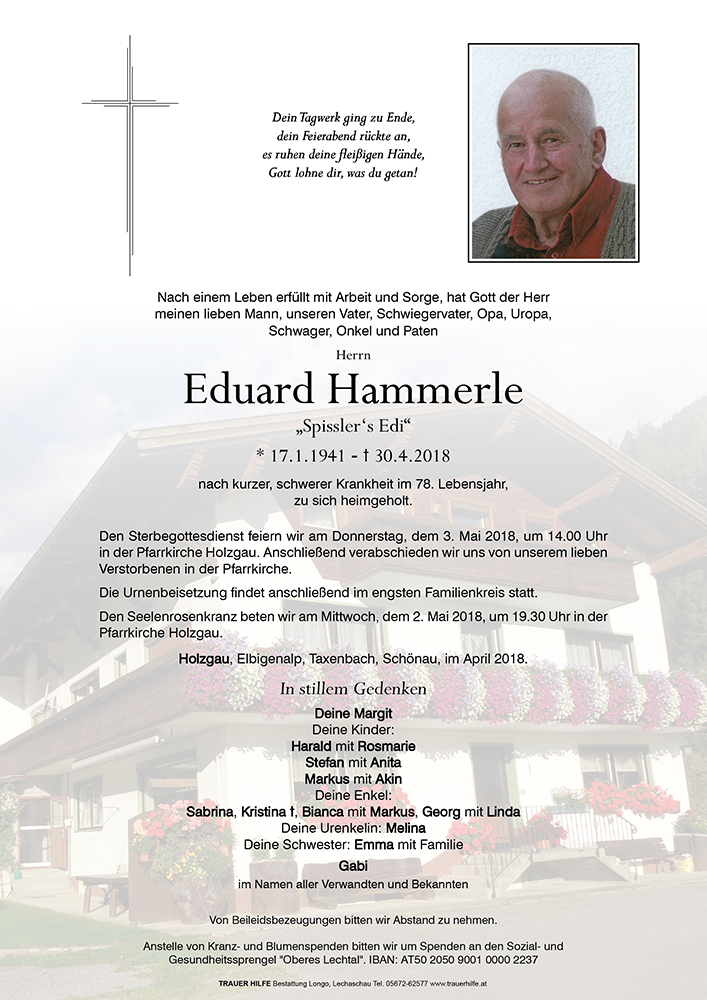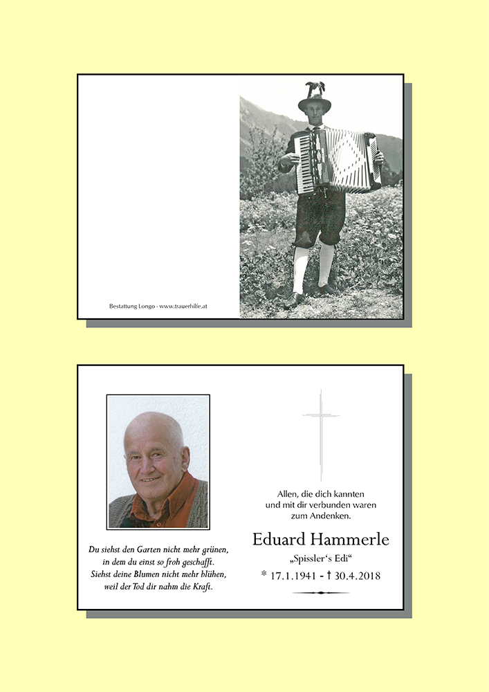 Liebe Trauerfamilie Hammerle, liebe Margit! Herzliches BEILEID, Mitgefühl in eurem Leid und Schmerz, der liebe Gott sprach das große Amen für Edi, im Glauben auf ein Wiedersehen soll euch Kraft und Trost geben, Familie Sonnweber Luis und Helene