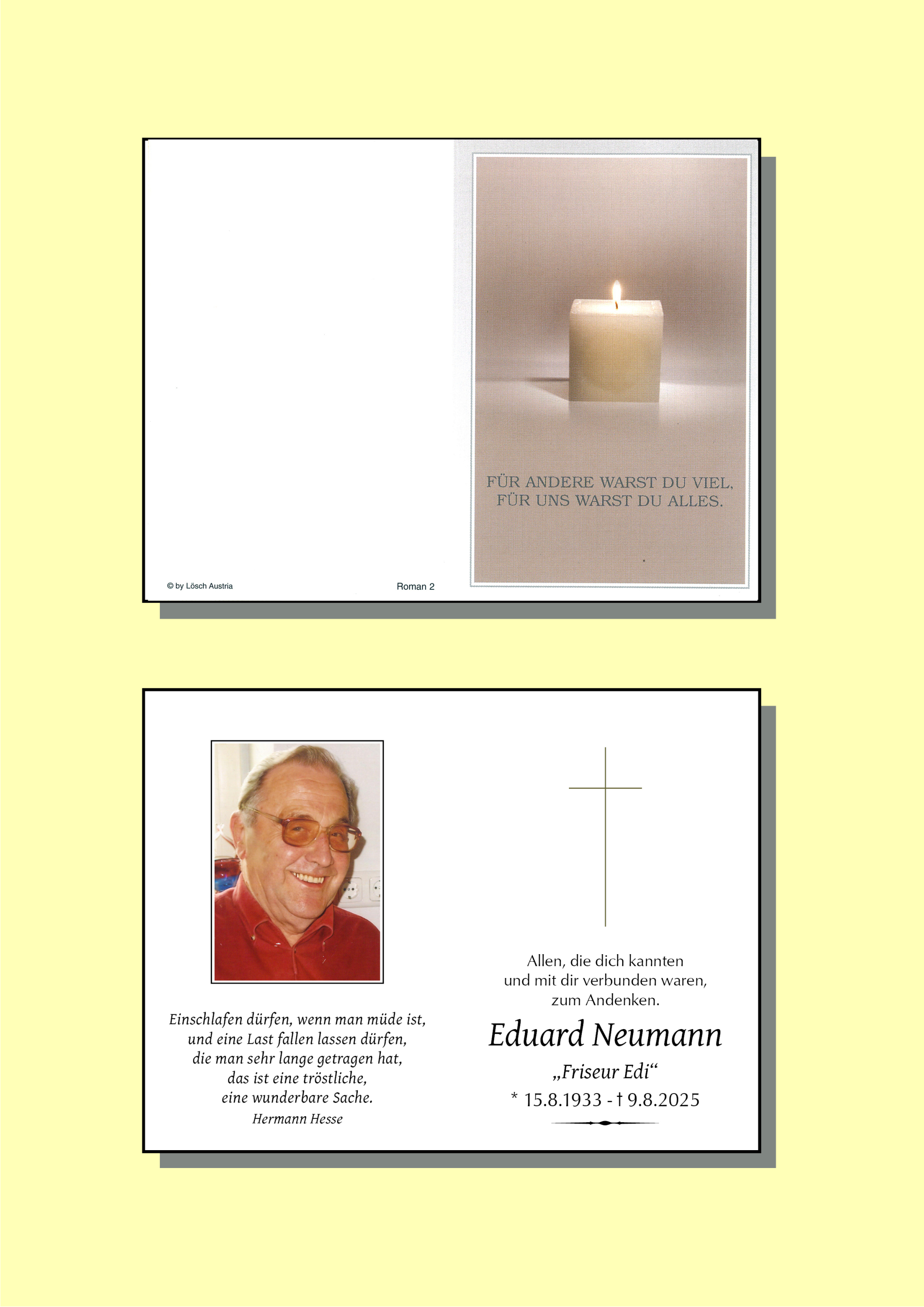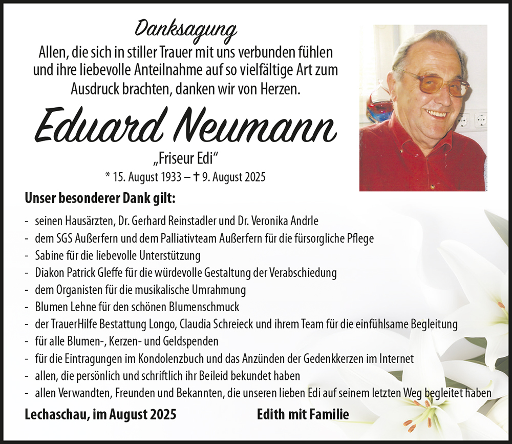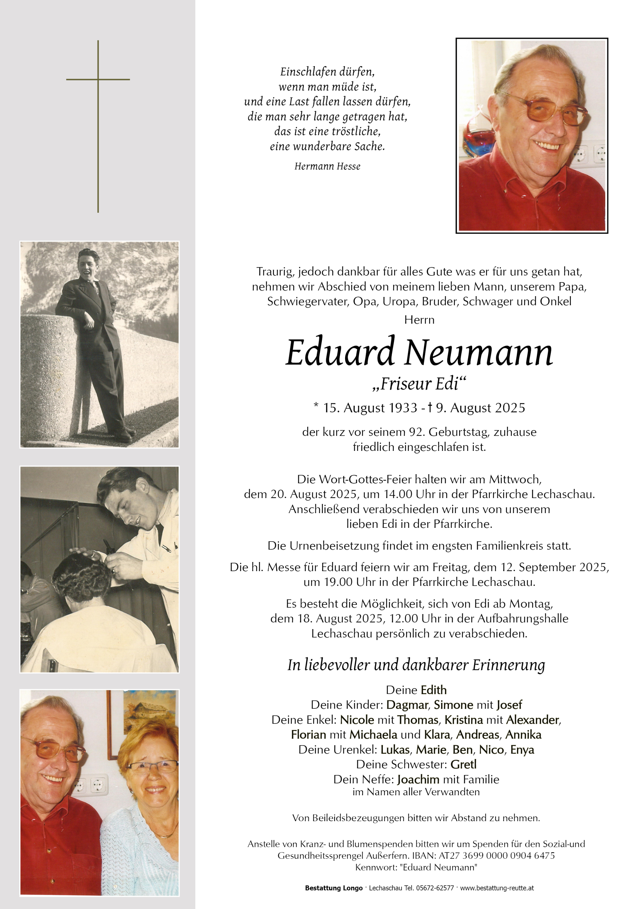 Was einen Menschen unsterblich macht sind seine Taten und die vielen Geschichten die es von ihm zu erzählen gibt. Meine Familie und ich waren jahrzehntelang Stammgast im „Salon Edi“! Und es war immer sehr schön dort … Es war stets wie „nach Hause kommen“ … wie ein fröhliches Familientreffen! Edi und Edith samt Team waren an Herzlichkeit und Fröhlichkeit nicht zu übertreffen. In unserer Erinnerung und in unserem Herzen bleiben die unzähligen fröhlichen Stunden mit Edi, die auferbauenden Gespräche und sein Humor und sein herzliches Lachen! Sein von Herzen kommender höflicher Charme gegenüber Damen allen Alters bleibt ebenfalls unvergessen!