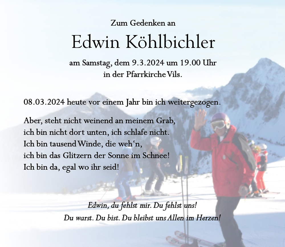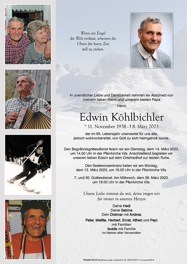 Habe leider vom tragischen Unfall von deinem Papa erfahren. Mein herzlichstes Beileid an dich, deine Mutter und Sabine. Edwin war für mich ein sehr guter Freund, vor allem während unserer gemeinsamen Zeit als Sportler. Aber auch danach, als ich in Pinswang beim Zoll war, war ich bei euch immer willkommen und ich erinnere mich gerne an diese Zeit und die Gespräche mit euch in eurer Stube. Dass ich ihn leider nicht treffen konnte, auch als ich vor einigen Jahren bei dir zu Besuch war, ist sehr schade. Ich persönlich habe Edwin als moralisch einwandfreien, charakterlich felsenfesten, freundlichen, lebenslustigen und hilfsbereiten Menschen kennen gelernt, für den denke ich die Familie sehr wichtig war, und alles getan hat um euch zu unterstützen so lange es ihm möglich war.