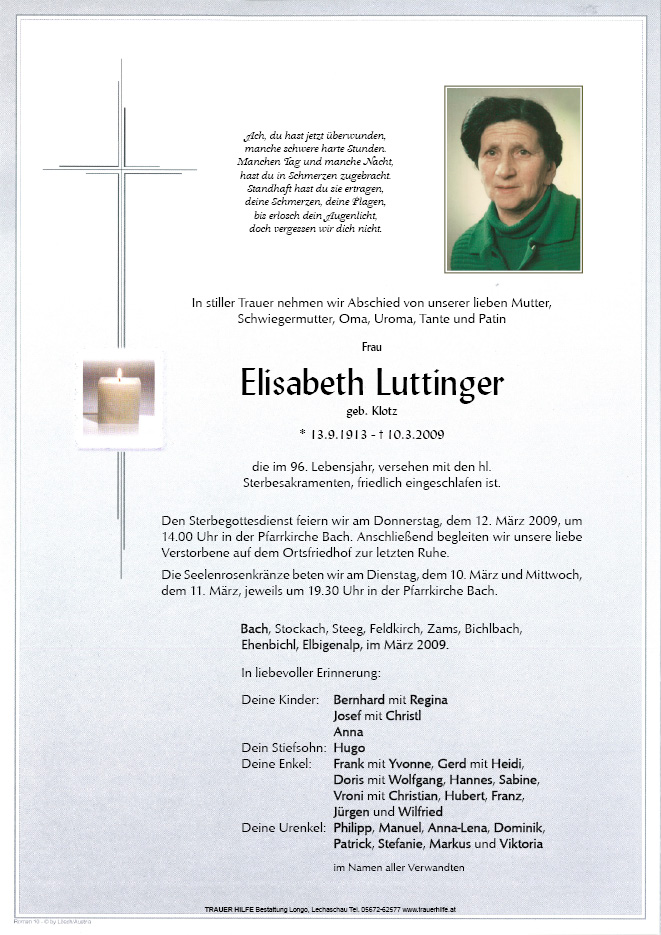 13.12.1901 10.03.2009 Bach Elisabeth Luttinger Action Parte Gedenkkerzen Kondolenzen Parte Gedenkkerzen Kondolenzen Parte herunterladen Gedenkkerzen für Elisabeth Luttinger 6 Einträge Kerze anzünden . . . habs fein im Himmel ! Doris und Wolfgang Doris und Wolfgang Ruhe in Frieden Wir sehen uns wieder Nicht vergessen Ihre Gedenkkerze fürElisabeth Luttinger Ihr Name* Farbe auswählen Ihre Nachricht oder Name* E-Mail-Adresse* Mit dem Klicken auf "Kerze anzünden" erklären Sie sich mit unseren Datenschutzbestimmungen einverstanden. Kondolenzbuch für Elisabeth Luttinger 0 Einträge Kondolenz verfassen Ihr Abschiedsgruß an Elisabeth Luttinger Ihr Name* E-Mail-Adresse* Ihre Nachricht* Mit dem Klicken auf "Gruß absenden" erklären Sie sich mit unseren Datenschutzbestimmungen einverstanden.