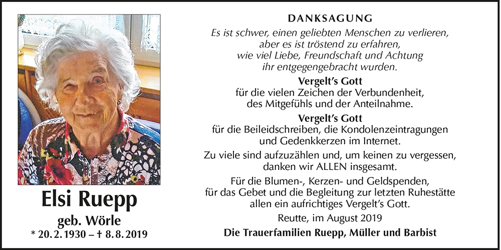 Zum Tod eurer lieben Mama und Oma möchten wir euch unser herzliches Beileid aussprechen. Auch wenn man weiß, daß der Abschied nahe ist, ist es ein großer Verlust und erfüllt uns mit Traurigkeit. Elsi war ein lieber Mensch, sie ist uns stets mit einem Lächeln begegnet und so werden wir sie auch in Erinnerung behalten.